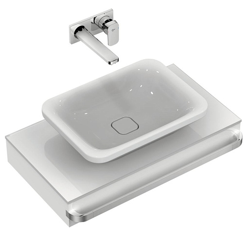 столешницей R4331SA и настенным смесителем или с асимметричной чашей Tonic II 55 см K0833 со стеклянной белой столешницей R4335SA с отверстием под смеситель с удлиненным корпусом или соло без умывальника в качестве полки, со столешницей R4322.
