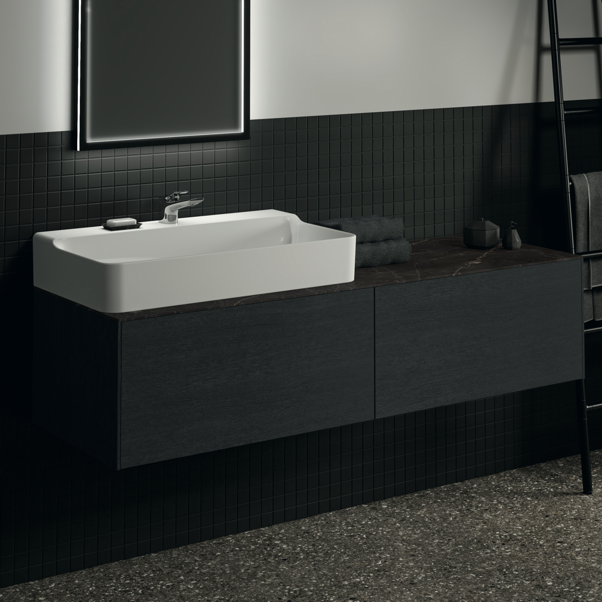 CONCA Столешница 160 см (литьевой мрамор), для монтажа с подстольем для умывальника, проекция 50,5 см. Без выреза / вырез под заказ. Заказ столешницы из литьевого мрамора с вырезом должен сопровождаться заполнением формы (Bespoke order form), т.к. вырез готовится в зависимости от выбранного умывальника