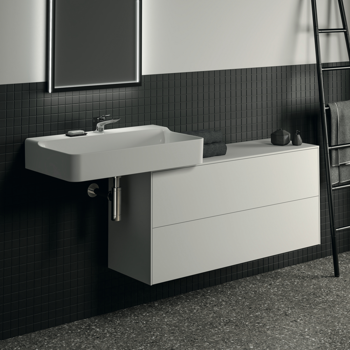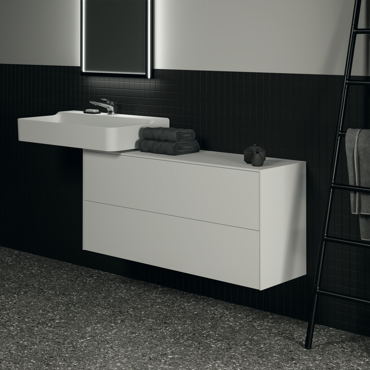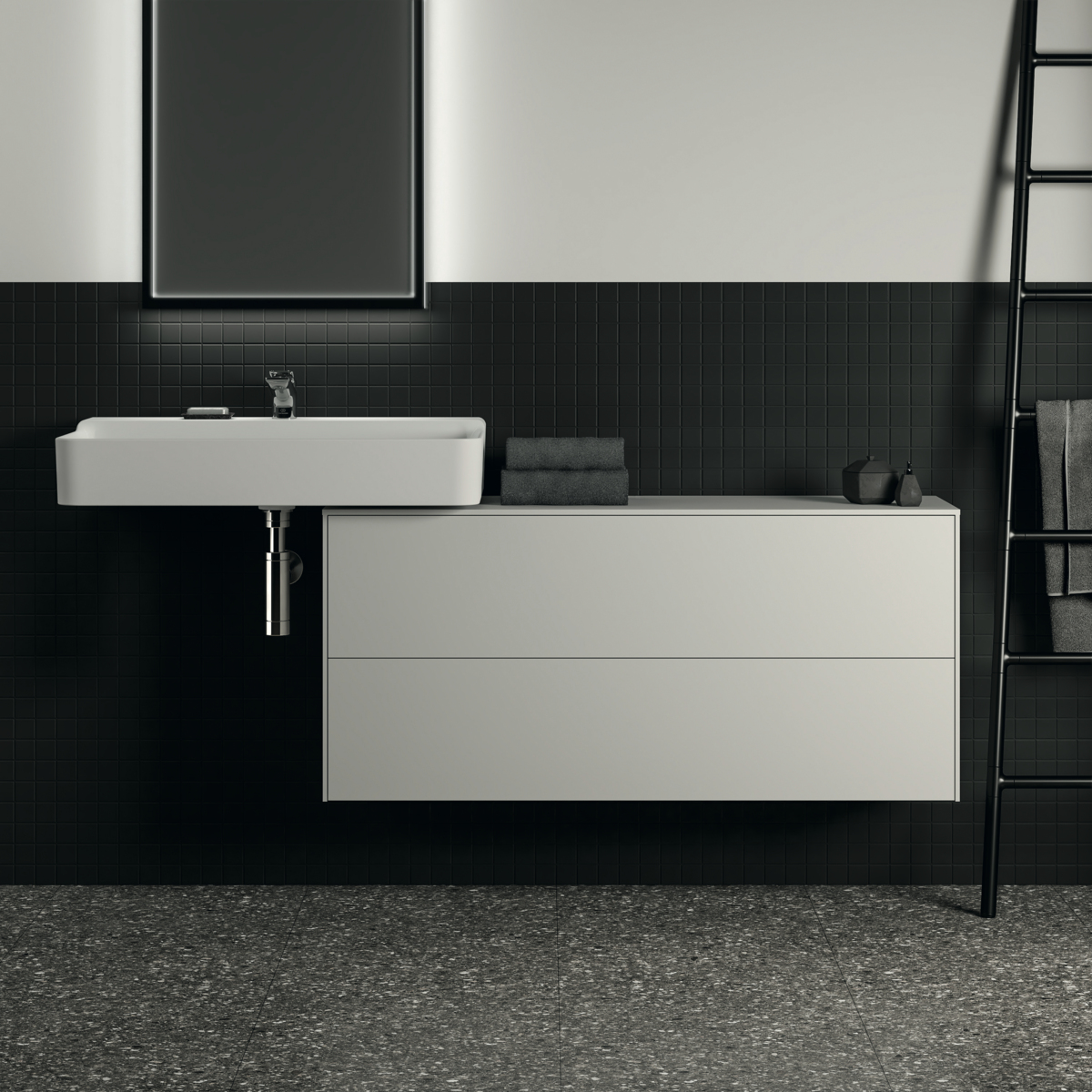 CONCA Тумба 120 см для раковины, узкая проекция 37 см, без выреза в столешнице. Комбинированная система для удобного использования (открытие "Push to open" + закрытие "Soft close"). Внутренняя отделка ящиков цвета антрацит. 2 внешних ящика. Для монтажа с раковинами Conca 40/50/60/80/100 см (с шлифованной нижней поверхностью) или Conca vessel 45/60 см или Extra 45/50/60/70/80/100 см (с шлифованной нижней поверхностью) или Extra vessel 50/60 см или Ipalyss vessel 40/55/60/65/80 см или Linda-X 50/60/75 см (с шлифованной нижней поверхностью) или Linda-X vessel 45/55 см