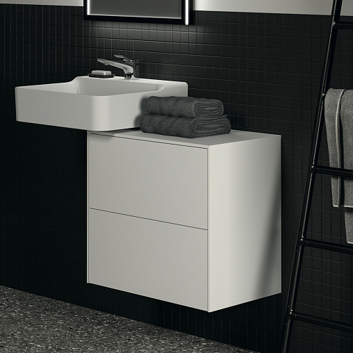 CONCA Тумба 60 см для раковины, узкая проекция 37 см, без выреза в столешнице. Комбинированная система для удобного использования (открытие "Push to open" + закрытие "Soft close"). Внутренняя отделка ящиков цвета антрацит. 2 внешних ящика. Для монтажа с раковинами Conca 40/50 см (с шлифованной нижней поверхностью) или Conca vessel 45 см или Extra 45/50 см (с шлифованной нижней поверхностью) или Extra vessel 50 см или Ipalyss vessel 40/55/60 см или Linda-X 50/60 см (с шлифованной нижней поверхностью) или Linda-X vessel 45/55 см