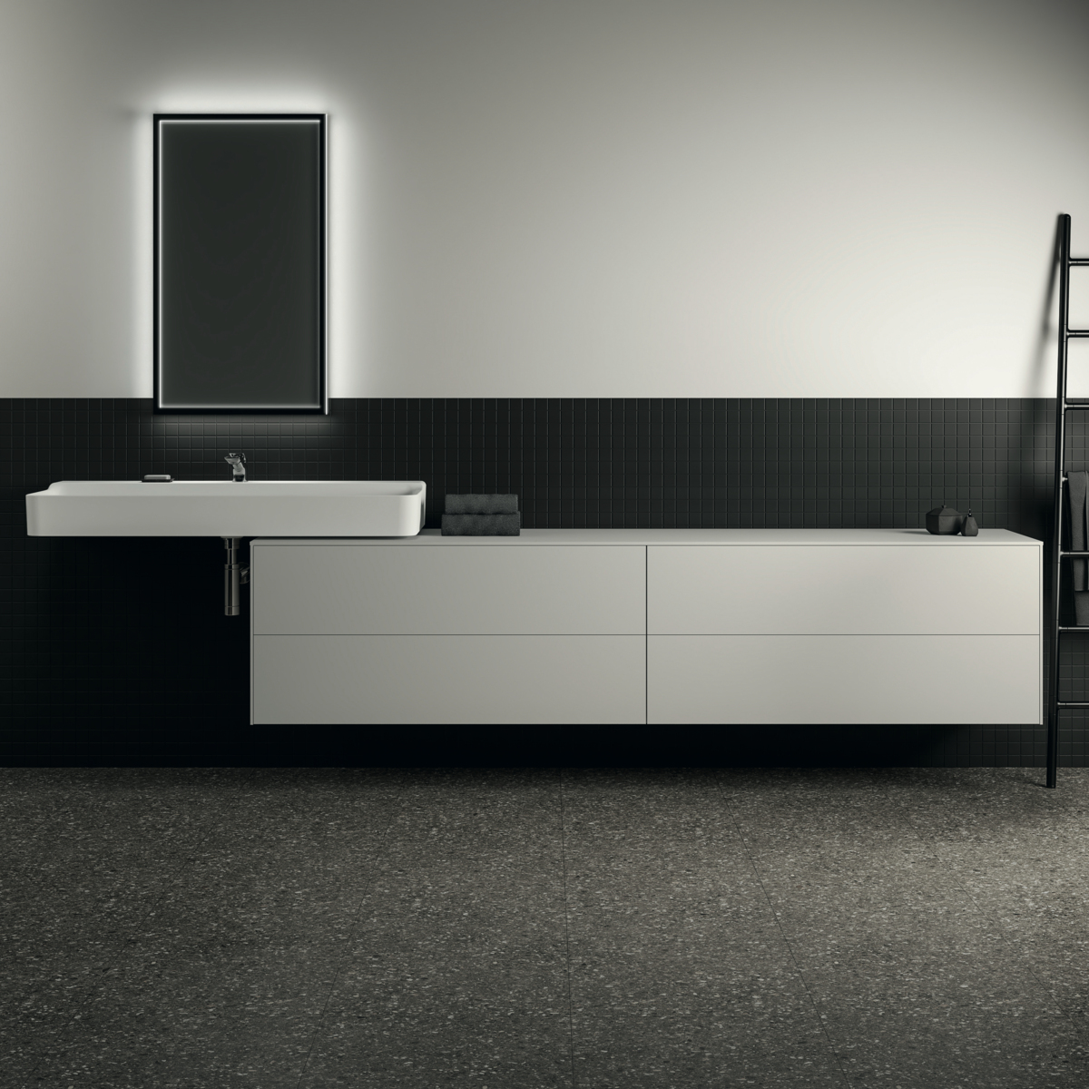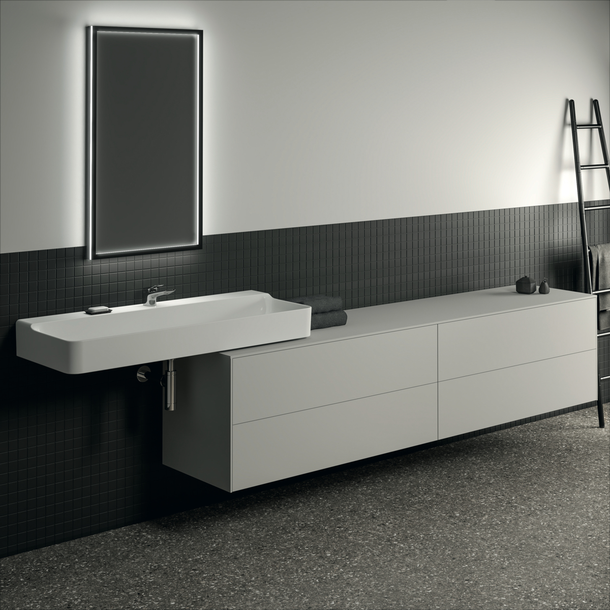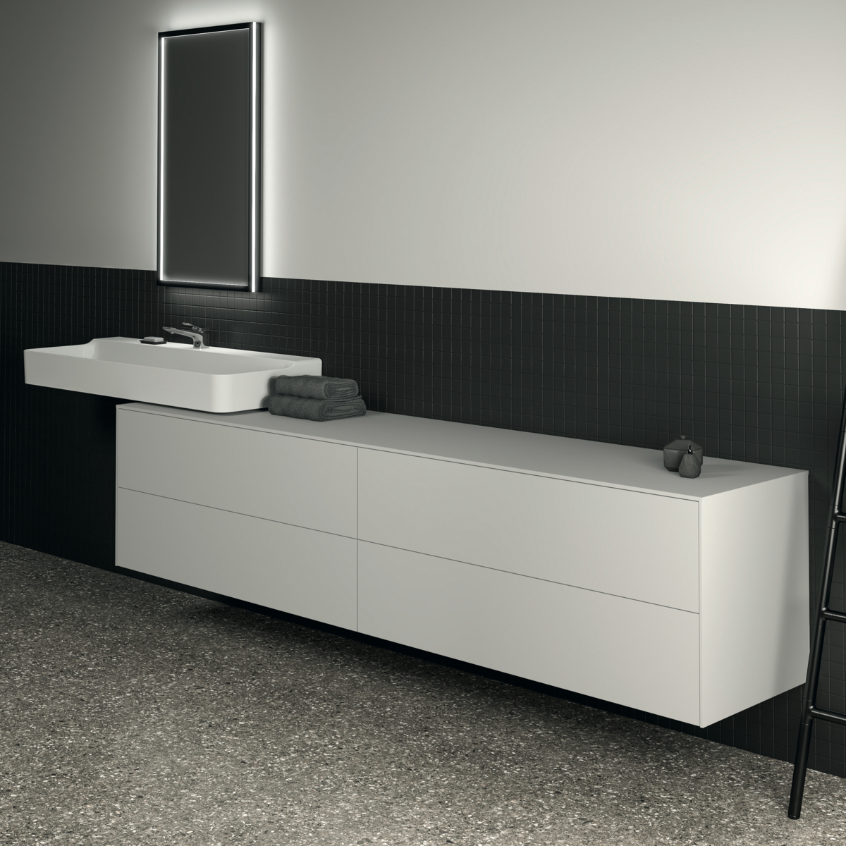 CONCA Тумба 240 см для раковины, без выреза в столешнице. Комбинированная система для удобного использования (открытие "Push to open" + закрытие "Soft close"). Внутренняя отделка ящиков цвета антрацит. 4 ящика. Для монтажа с раковинами Conca 40/50/60/80/100/120 см (с шлифованной нижней поверхностью) или Conca vessel 45/60 см или Extra 45/50/60/70/80/100 см (с шлифованной нижней поверхностью) или Extra vessel 50/60 см или Ipalyss vessel 40/55/60/65/80 см или Linda-X 50/60/75 см (с шлифованной нижней поверхностью) или Linda-X vessel 45/55 см