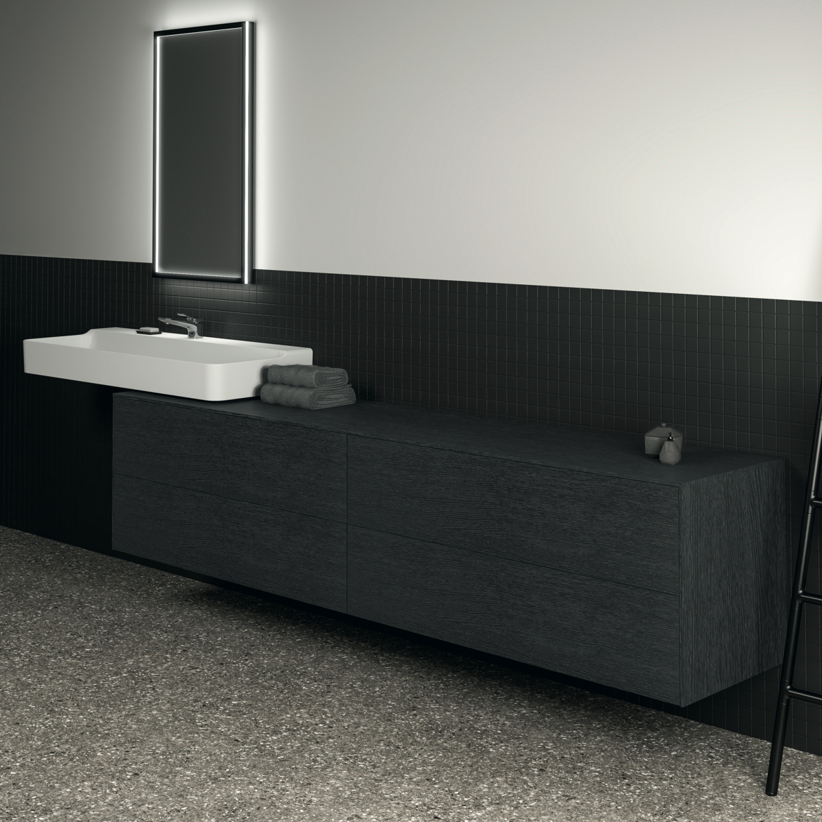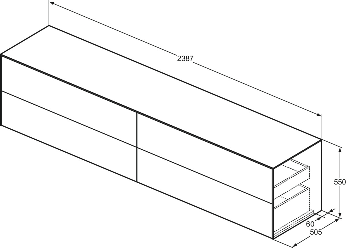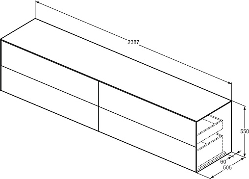 CONCA Тумба 240 см для раковины, без выреза в столешнице. Комбинированная система для удобного использования (открытие "Push to open" + закрытие "Soft close"). Внутренняя отделка ящиков цвета антрацит. 4 ящика. Для монтажа с раковинами Conca 40/50/60/80/100/120 см (с шлифованной нижней поверхностью) или Conca vessel 45/60 см или Extra 45/50/60/70/80/100 см (с шлифованной нижней поверхностью) или Extra vessel 50/60 см или Ipalyss vessel 40/55/60/65/80 см или Linda-X 50/60/75 см (с шлифованной нижней поверхностью) или Linda-X vessel 45/55 см