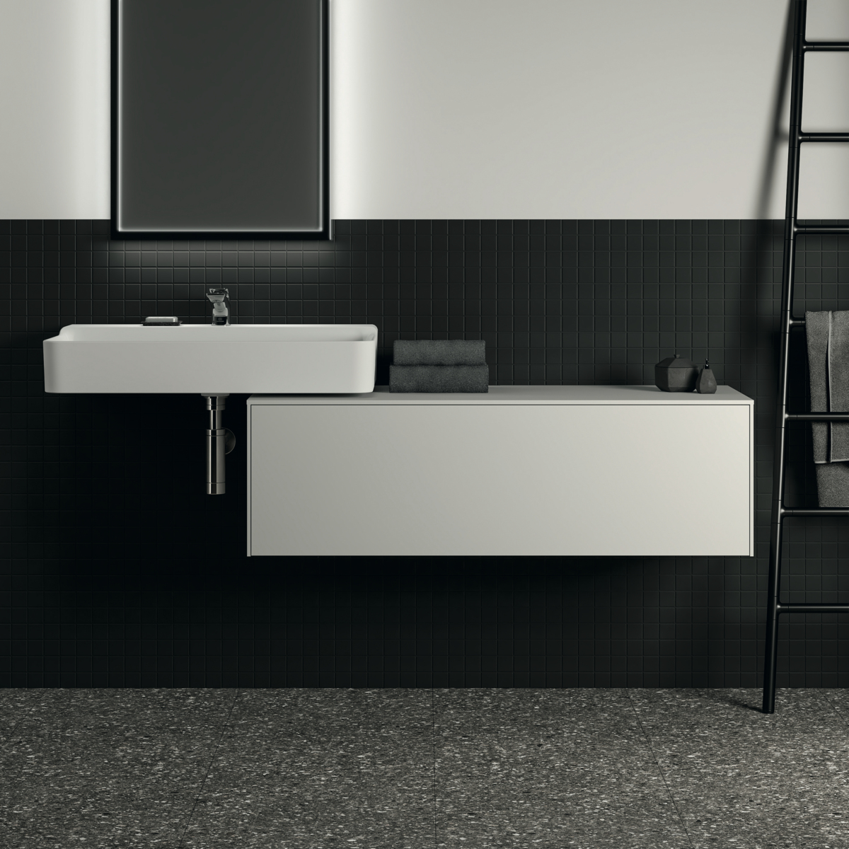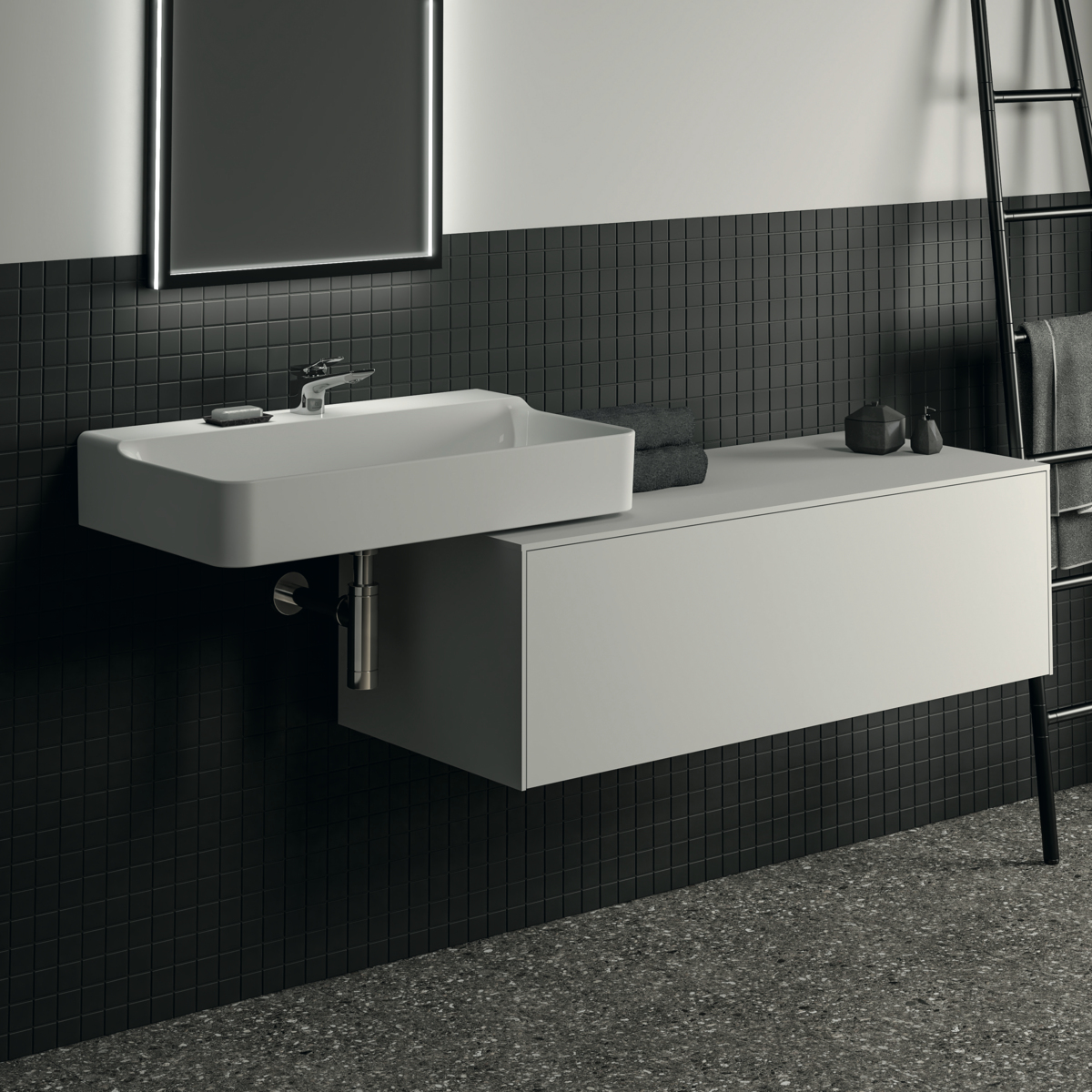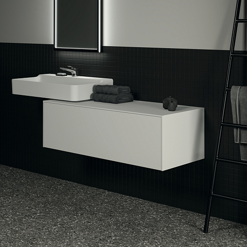 CONCA Тумба 120 см для раковины, без выреза в столешнице. Комбинированная система для удобного использования (открытие "Push to open" + закрытие "Soft close"). Внутренняя отделка ящиков цвета антрацит. 1 ящик. Для монтажа с раковинами Conca 40/50/60/80/100 см (с шлифованной нижней поверхностью) или Conca vessel 45/60 см или Extra 45/50/60/70/80/100 см (с шлифованной нижней поверхностью) или Extra vessel 50/60 см или Ipalyss vessel 40/55/60/65/80 см или Linda-X 50/60/75 см (с шлифованной нижней поверхностью) или Linda-X vessel 45/55 см
