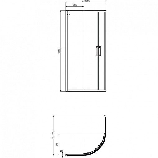 Высота 195 см, радиус 55 см, безопасное прозрачное стекло 6 мм, антиизвестковое покрытие Ideal Clean, алюминиевый профиль Silk black, хромированные ручки 225 мм, функция “Click & clean”,