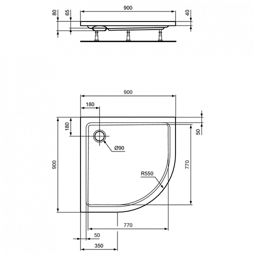 HOTLINE Акриловый сегментный душевой поддон 90X90X7 см. Отверстие слива 90 мм.
