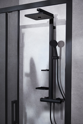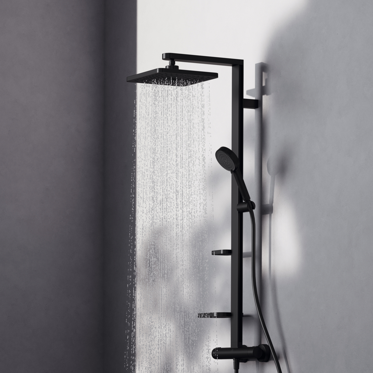 Душевая система без излива Alu + матовый, 2 режима ручной лейки, 26 см, square, чёрный цвет, термостат, верхний душ, с лейкой