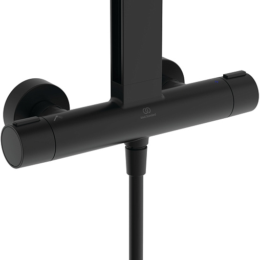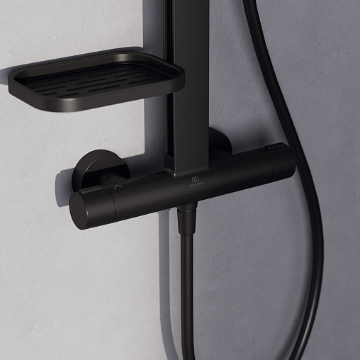 ALU+ Душевая система в комплекте с термостатическим смесителем для душа. Монтаж на стандартных эксцентриках, термостатический картридж PreciTherm®, затворы на керамических дисках G1/2 90˚, технология «Cool body» («Холодный корпус»), пластиковые рукоятки с ограничителями температуры (40ºC) и потока воды (50%), встроенные обратные клапаны. Штанга с направляющими справа и слева для установки держателя и полок по выбору при первичном монтаже. Держатель лейки с регулируемым углом наклона; свободная высота регулировки кронштейна крепления к стене. Квадратный 2-функциональный верхний душ 260х260 мм, ограничение потока 12 л/мин. 2-функциональная душевая лейка 100 мм с ограничением потока 8 л/мин. Маленькая полочка 130 мм (макс. нагрузка 7кг), большая полочка 208 мм (макс. нагрузка 7кг). Шланг 1750 мм Idealflex