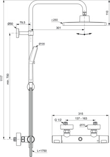 Ceratherm, душевая система без излива, 2 режима ручной лейки, 26 см, square, с лейкой, термостат, верхний душ, T25N, арт. A8521AA, Ideal Standard