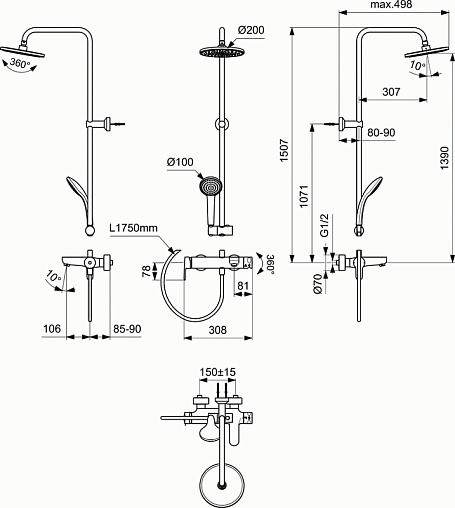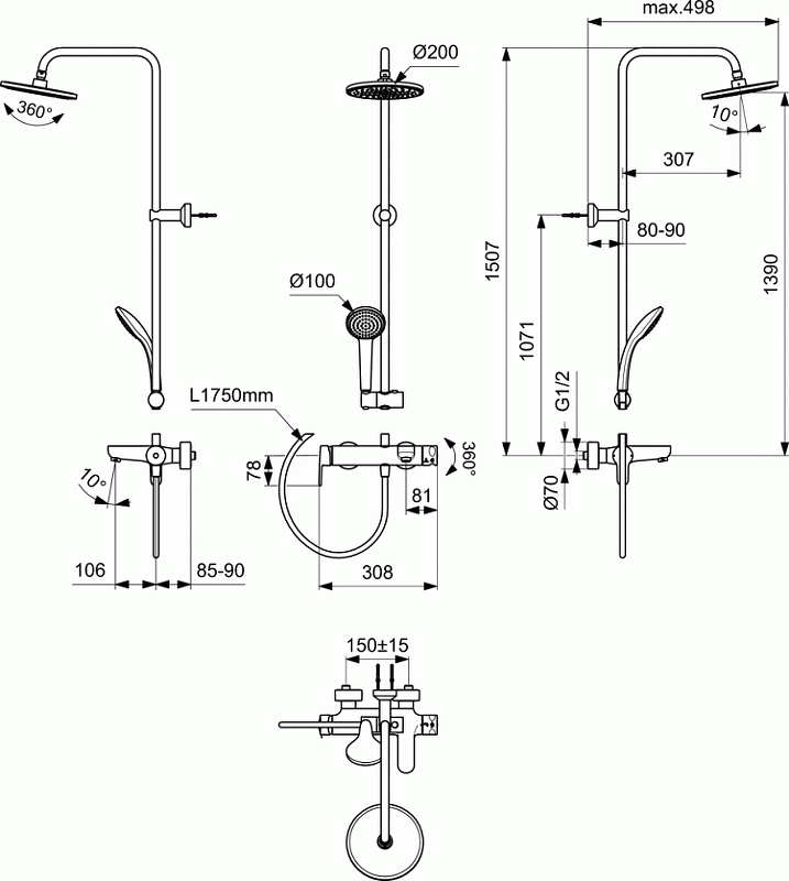 Cerafine О, душевая система, 1 режим, 20 см, round, неповор. излив, термостат, верхний душ, с лейкой, арт. BC749AA, Ideal Standard