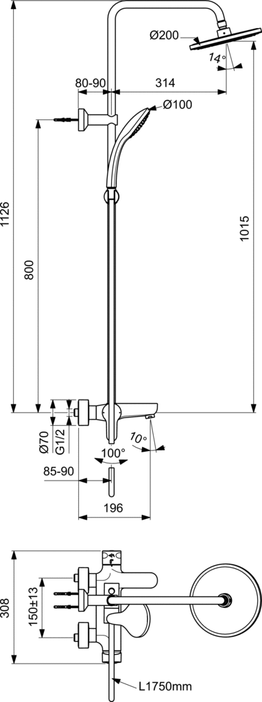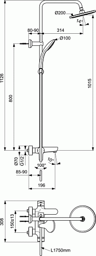 IdealRain Cerafine O, душевая система, 1 режим, 20 см, round, чёрный цвет, верхний душ, с лейкой, неповор. излив, арт. BC525XG, Ideal Standard