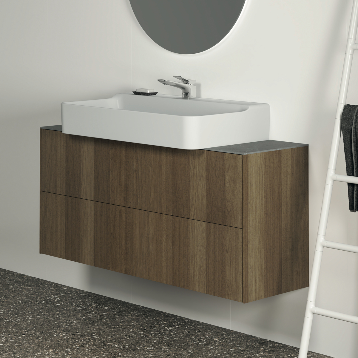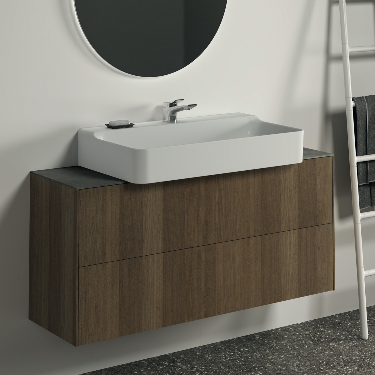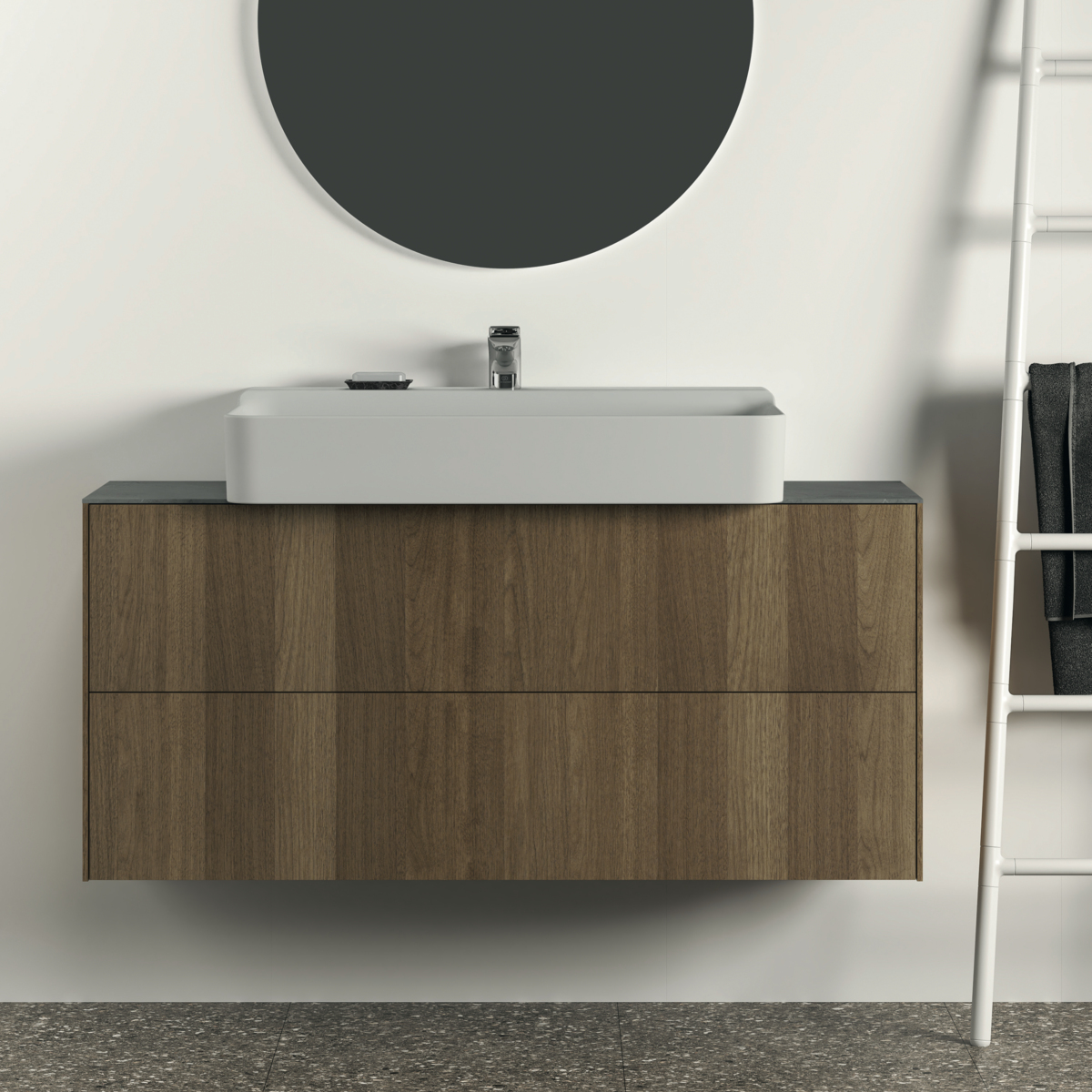 CONCA Тумба 120 см для раковины, узкая проекция 37 см, без столешницы. Комбинированная система для удобного использования (открытие "Push to open" + закрытие "Soft close"). Внутренняя отделка ящиков цвета антрацит. 2 внешних ящика. Для монтажа со столешницей из литьевого мрамора (без выреза / вырез под заказ) 120 см T4347.