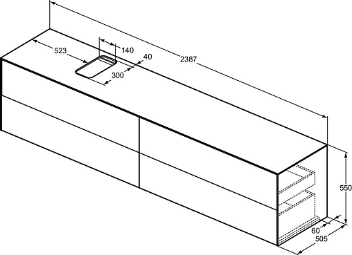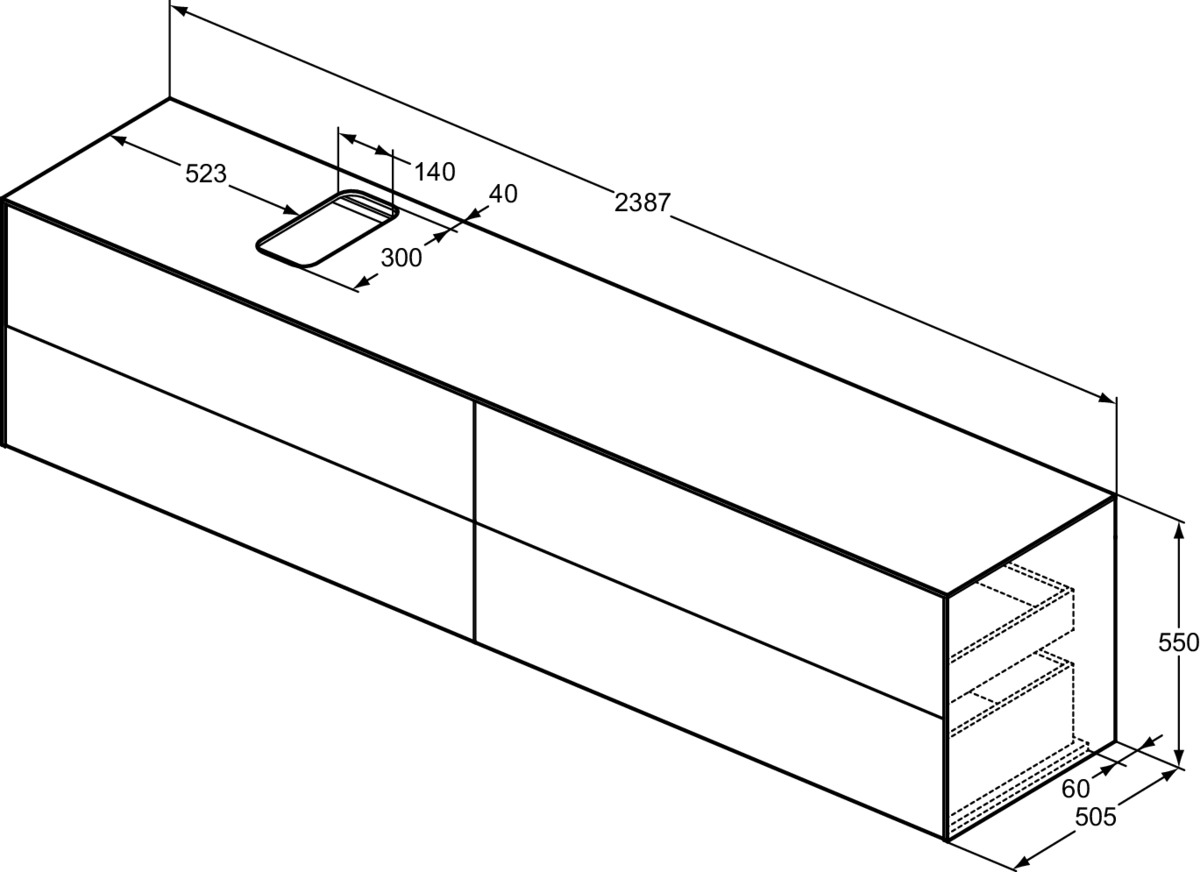 Модуль под раковину Conca 238,7х50,5х55 см, вырез в столешнице под заказ, 4 ящика, копченый дуб, система push-to-open