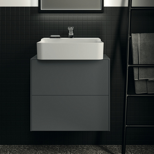 CONCA Тумба 60 см для раковины, узкая проекция 37 см, без столешницы. Комбинированная система для удобного использования (открытие "Push to open" + закрытие "Soft close"). Внутренняя отделка ящиков цвета антрацит. 2 внешних ящика. Для монтажа со столешницей из литьевого мрамора (без выреза / вырез под заказ) 60 см T4344