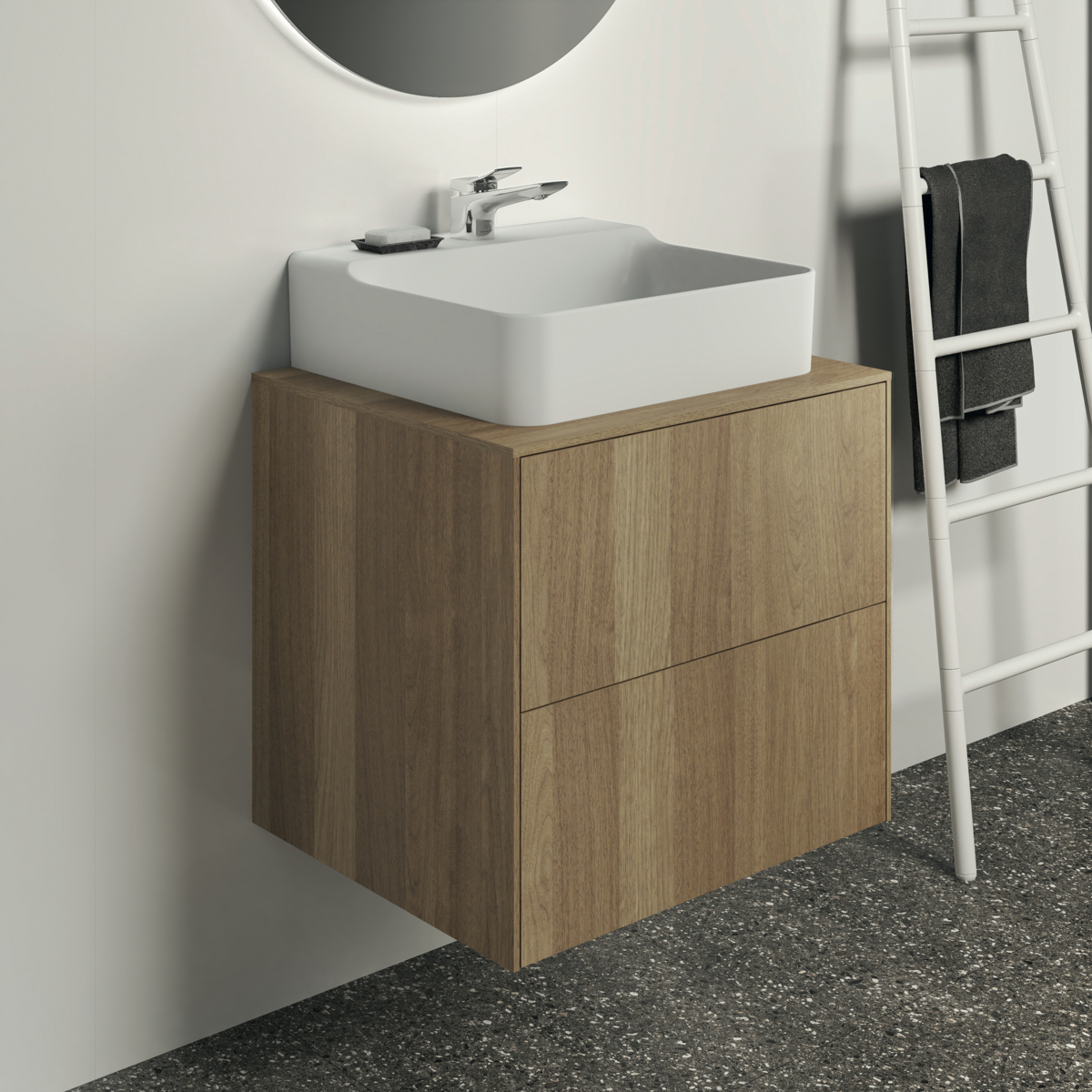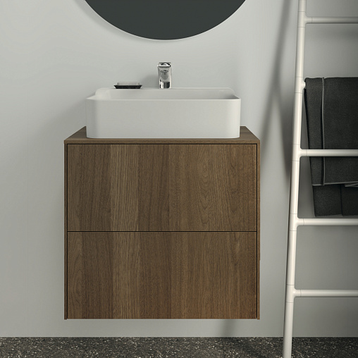 CONCA Тумба 60 см для раковины, центральный вырез в столешнице. Комбинированная система для удобного использования (открытие "Push to open" + закрытие "Soft close"). Внутренняя отделка ящиков цвета антрацит. 2 ящика. Для монтажа с раковинами Conca 40/50 см (с шлифованной нижней поверхностью) или Conca vessel 45 см или Extra 45/50 см (с шлифованной нижней поверхностью) или Extra vessel 50 см или Ipalyss vessel 40/55/60 см или Linda-X 50/60 см (с шлифованной нижней поверхностью)