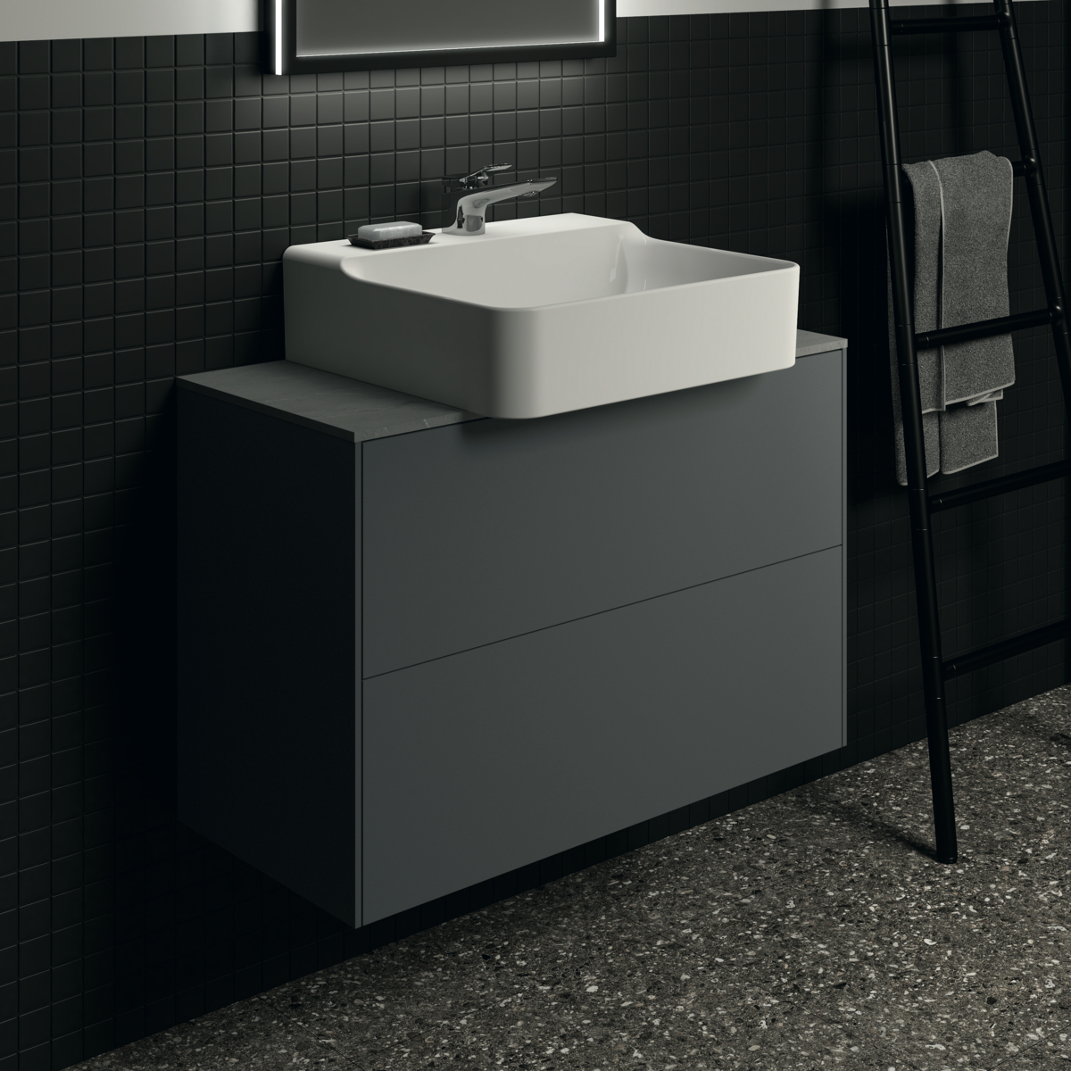 CONCA Тумба 80 см для раковины, узкая проекция 37 см, без столешницы. Комбинированная система для удобного использования (открытие "Push to open" + закрытие "Soft close"). Внутренняя отделка ящиков цвета антрацит. 2 внешних ящика. Для монтажа со столешницей из литьевого мрамора (без выреза / вырез под заказ) 80 см T4345