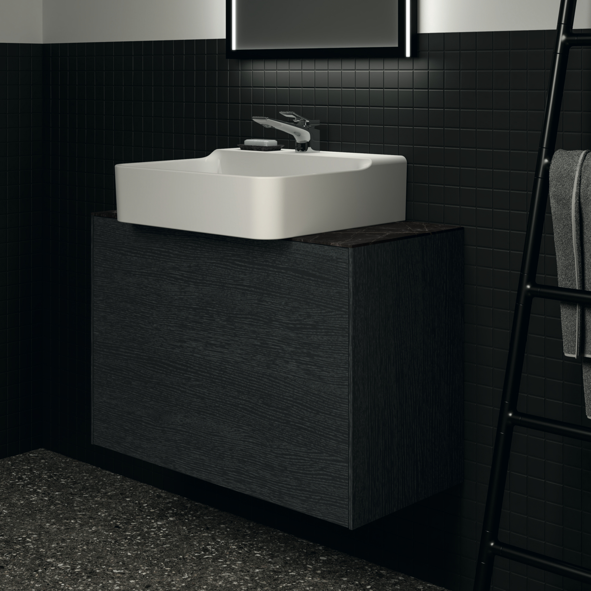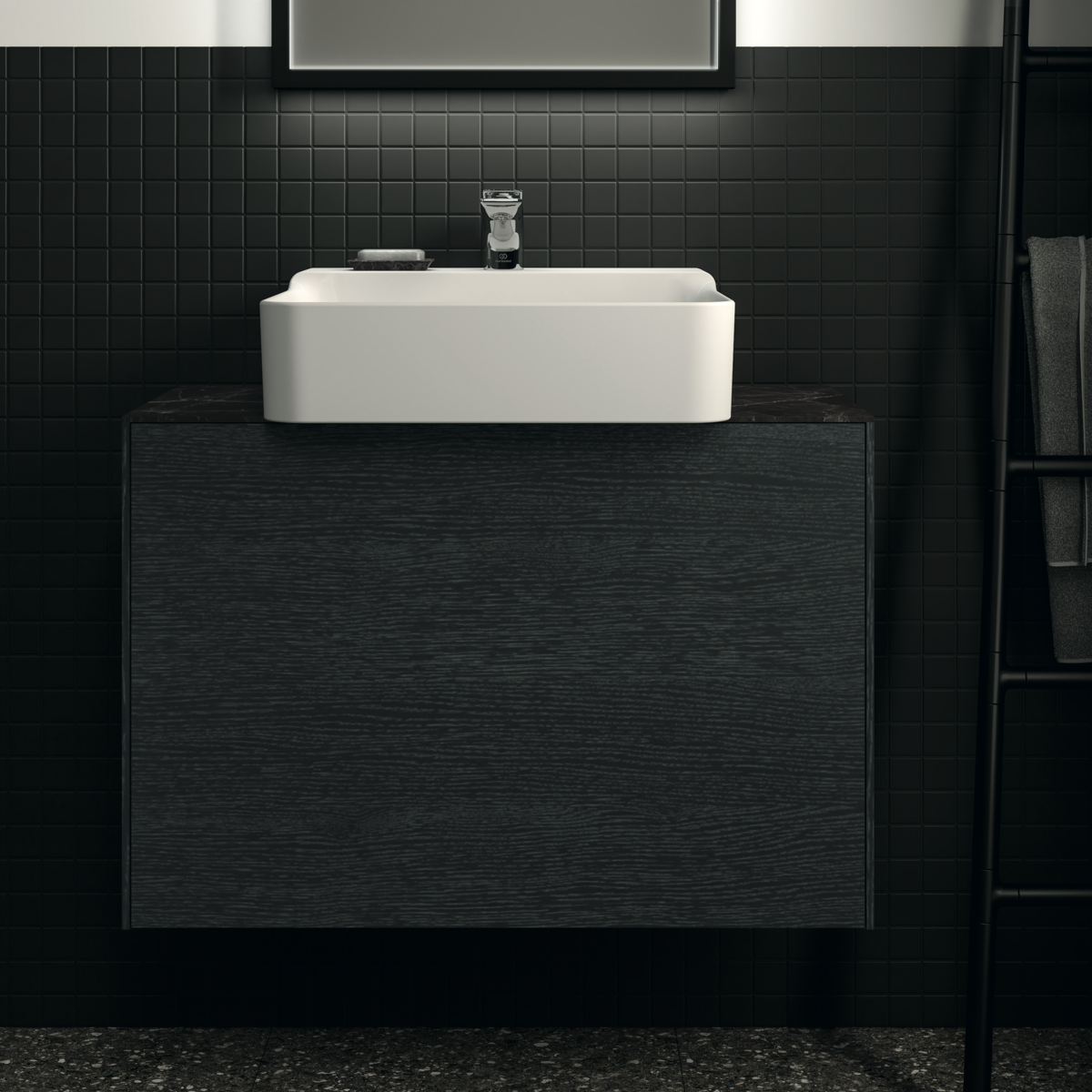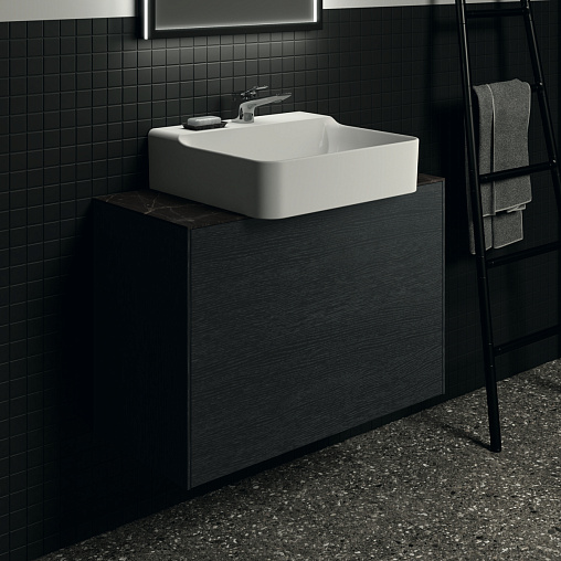 CONCA Тумба 80 см для раковины, узкая проекция 37 см, без столешницы. Комбинированная система для удобного использования (открытие "Push to open" + закрытие "Soft close"). Внутренняя отделка ящиков цвета антрацит. 1 внешний и 1 внутренний ящик. Для монтажа со столешницей из литьевого мрамора (без выреза / вырез под заказ) 80 см T4345.