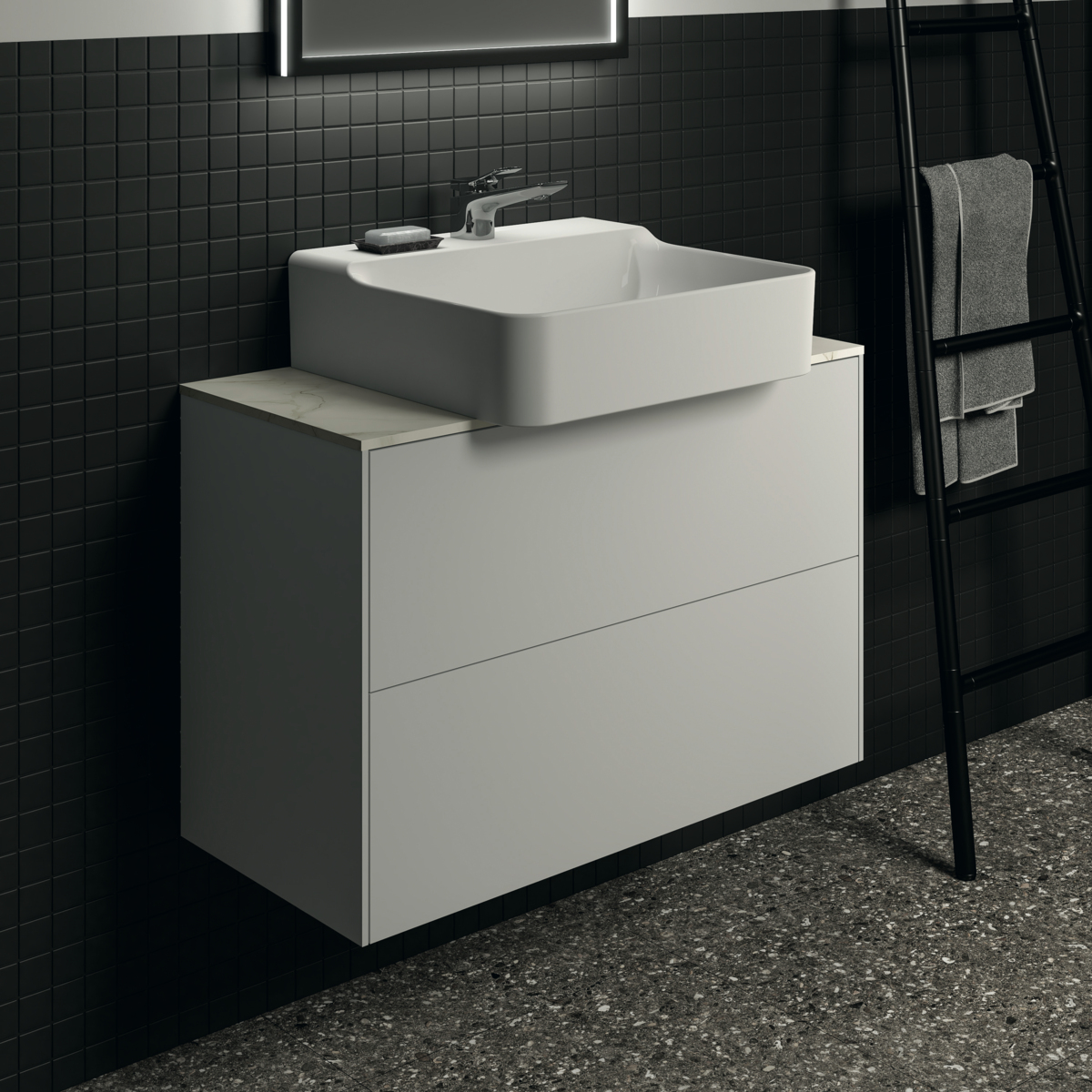 CONCA Столешница 80 см (литьевой мрамор), для монтажа с подстольем для умывальника, узкая проекция 37 см. Без выреза / вырез под заказ. Заказ столешницы из литьевого мрамора с вырезом должен сопровождаться заполнением формы (Bespoke order form), т.к. вырез готовится в зависимости от выбранного умывальника