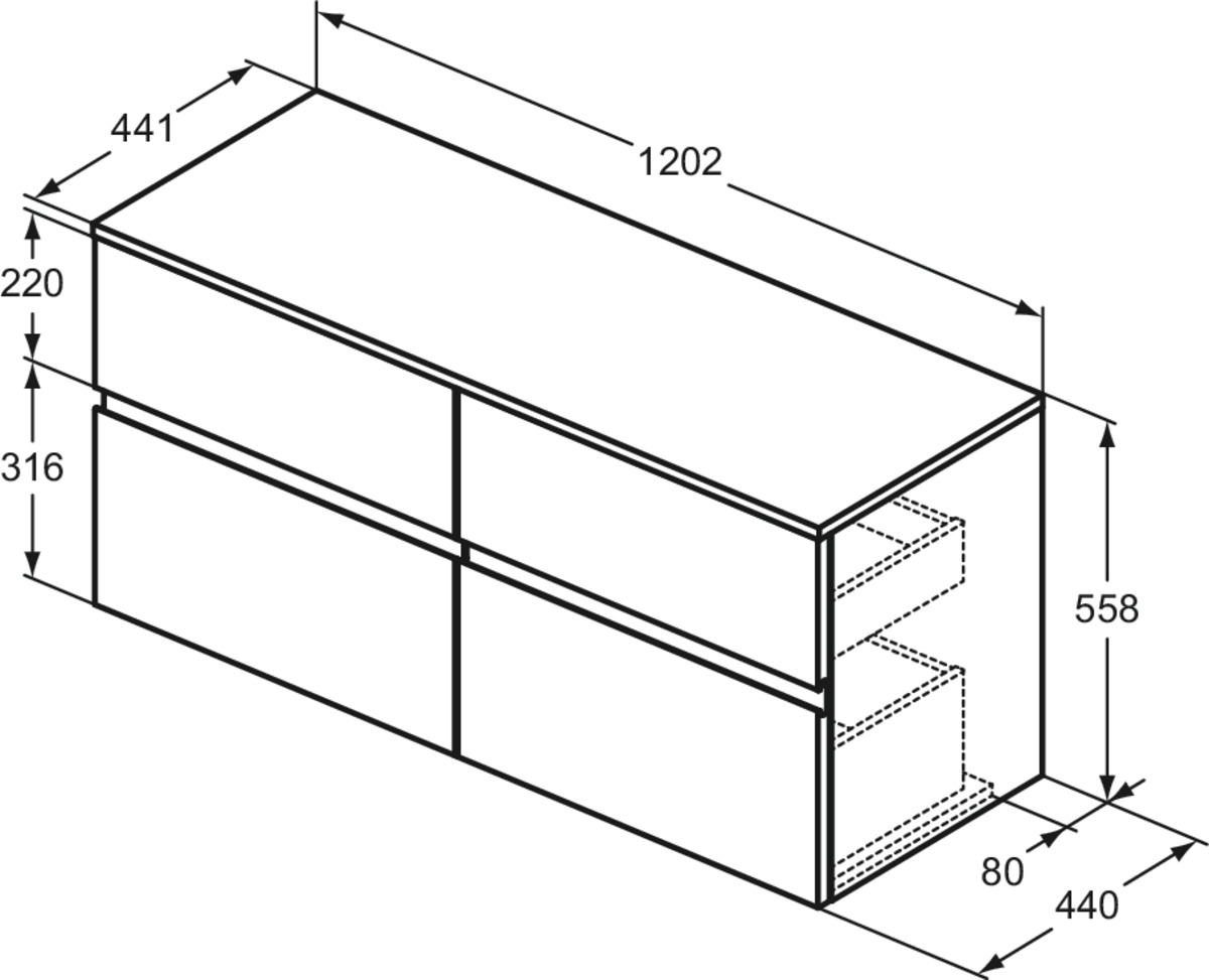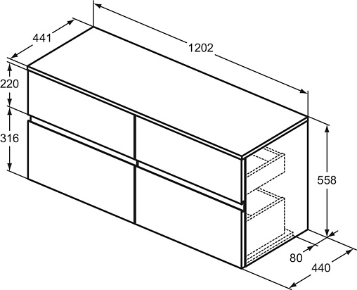 FINESSE Тумба со столешницей 120х44 см для подвесного монтажа, 4 ящика, система плавного закрытия. Конструкция без ручек - паз под верхним и над нижним выдвижными ящиками для легкого открывания. C крепежом. Рекомендуется сифон Space Saving EE23033967 (заказывается дополнительно). Для монтажа с раковинами Linda-X 60 см T4988, T4990, T4989 / Linda-X 50 см T4985, T4987, T4986 / Conca 60 см T3818, T3822, T3823, T3825, T3819, T3824 / Conca 50 см T3812, T3814, T3815, T3817, T3813, T3816 / Conca 40 см T3876, T3877, T3878, T3879 / Extra 60 см T3889, T3891, T3890 / Extra 50 см T3884, T3886, T3885 / Extra 45 см T3917, T3918 / Extra 45 см T3920, T3921 / Extra 45 см T3923, T3924 / Strada II 60 см T3644 / Strada II 50 см T3643 / Linda-X T4399, T4400, T4401, T4402 / Ipalyss E1396, E1397, E1398, E1413 / Conca T3696, T3698 / Extra T3740, T3741 / La Dolce Vita E2717 / Strada II T2998, T2999, T2964, T2965, T2966, T2967, T2981, T3604, T2929, T2959, T2961, T2962, T2963 / Strada K0776, K0781, K0816, K0784, K0795 / Connect Air K0833, E0348 / I.Life B T5092, T5091, T5087