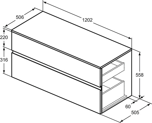 FINESSE Тумба со столешницей 120х50 см для подвесного монтажа, 2 ящика, система плавного закрытия. Конструкция без ручек - паз под верхним и над нижним выдвижными ящиками для легкого открывания. C крепежом. Рекомендуется сифон Space Saving EE23033967 (заказывается дополнительно). Для монтажа с раковинами Linda-X 75 см T4991, T4993, T4992 / Linda-X 60 см T4988, T4990, T4989 / Linda-X 50 см T4985, T4987, T4986 / Conca 100 см T3832, T3834, T3835, T3837, T3833, T3836 / Conca 80 см T3826, T3828, T3829, T3831, T3827, T3830 / Conca 60 см T3818, T3822, T3823, T3825, T3819, T3824 / Conca 50 см T3812, T3814, T3815, T3817, T3813, T3816 / Conca 40 см T3876, T3877, T3878, T3879 / Extra 100 см T3905, T3908, T3907 / Extra 80 см T3899, T3901, T3900 / Extra 70 см T3894, T3896, T3895 / Extra 60 см T3889, T3891, T3890 / Extra 50 см T3884, T3886, T3885 / Extra 45 см T3917, T3918 / Extra 45 см T3920, T3921 / Extra 45 см T3923, T3924 / Strada II 60 см T3644 / Strada II 100 см T3646 / Strada II 80 см T3645 / Strada II 60 см T3644 / Strada II 50 см T3643 / Linda-X T4399, T4400, T4401, T4402 / Ipalyss E1391, E1886, E1887, E1396, E1397, E1398, E1413 / Conca T3696, T3698 / Extra T3740, T3741 / La Dolce Vita E2717 / Strada II T2998, T2999, T2964, T2965, T2966, T2967, T2981, T3604, T2929, T2959, T2961, T2962, T2963 / Strada K0776, K0781, K0816, K0784, K0795 / Connect Air K0833, E0348 / I.Life B T5092, T5091, T5087