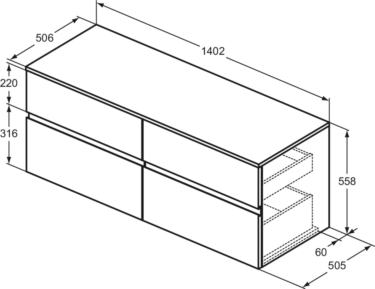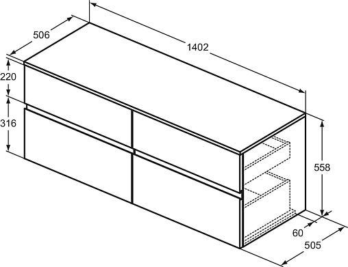 FINESSE Тумба со столешницей 140х50 см для подвесного монтажа, 4 ящика, система плавного закрытия. Конструкция без ручек - паз под верхним и над нижним выдвижными ящиками для легкого открывания. C крепежом. Рекомендуется сифон Space Saving EE23033967 (заказывается дополнительно). Для монтажа с раковинами Linda-X 75 см T4991, T4993, T4992 / Linda-X 60 см T4988, T4990, T4989 / Conca 60 см T3818, T3822, T3823, T3825, T3819, T3824 / Conca 50 см T3812, T3814, T3815, T3817, T3813, T3816 / Conca 40 см T3876, T3877, T3878, T3879 / Extra 70 см T3894, T3896, T3895 / Extra 60 см T3889, T3891, T3890 / Extra 50 см T3884, T3886, T3885 / Extra 45 см T3917, T3918 / Extra 45 см T3920, T3921 / Extra 45 см T3923, T3924 / Strada II 60 см T3644 / Strada II 50 см T3643 / Linda-X T4399, T4400, T4401, T4402 / Ipalyss E1391, E1886, E1887, E1396, E1397, E1398, E1413 / Conca T3696, T3698 / Extra T3740, T3741 / La Dolce Vita E2717 / Strada II T2998, T2999, T2964, T2965, T2966, T2967, T2981, T3604, T2929, T2959, T2961, T2962, T2963 / Strada K0776, K0781, K0816, K0784, K0795 / Connect Air K0833, E0348 / I.Life B T5092, T5091, T5087