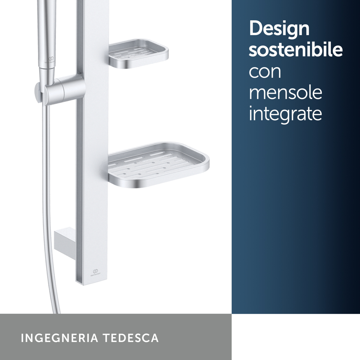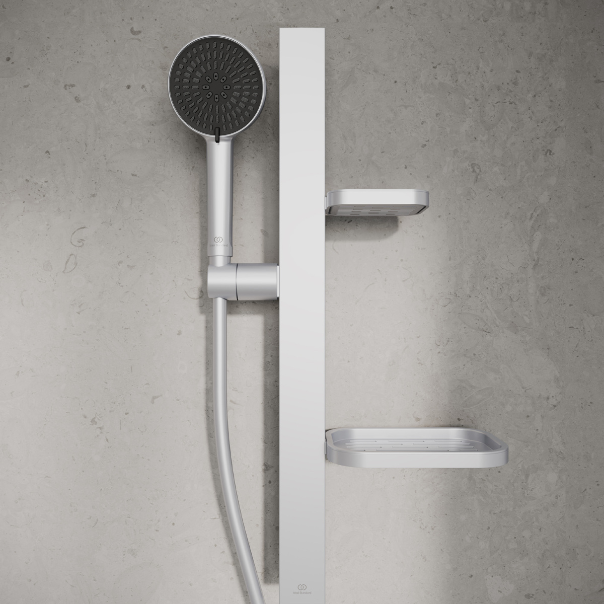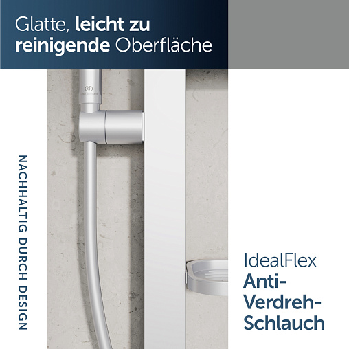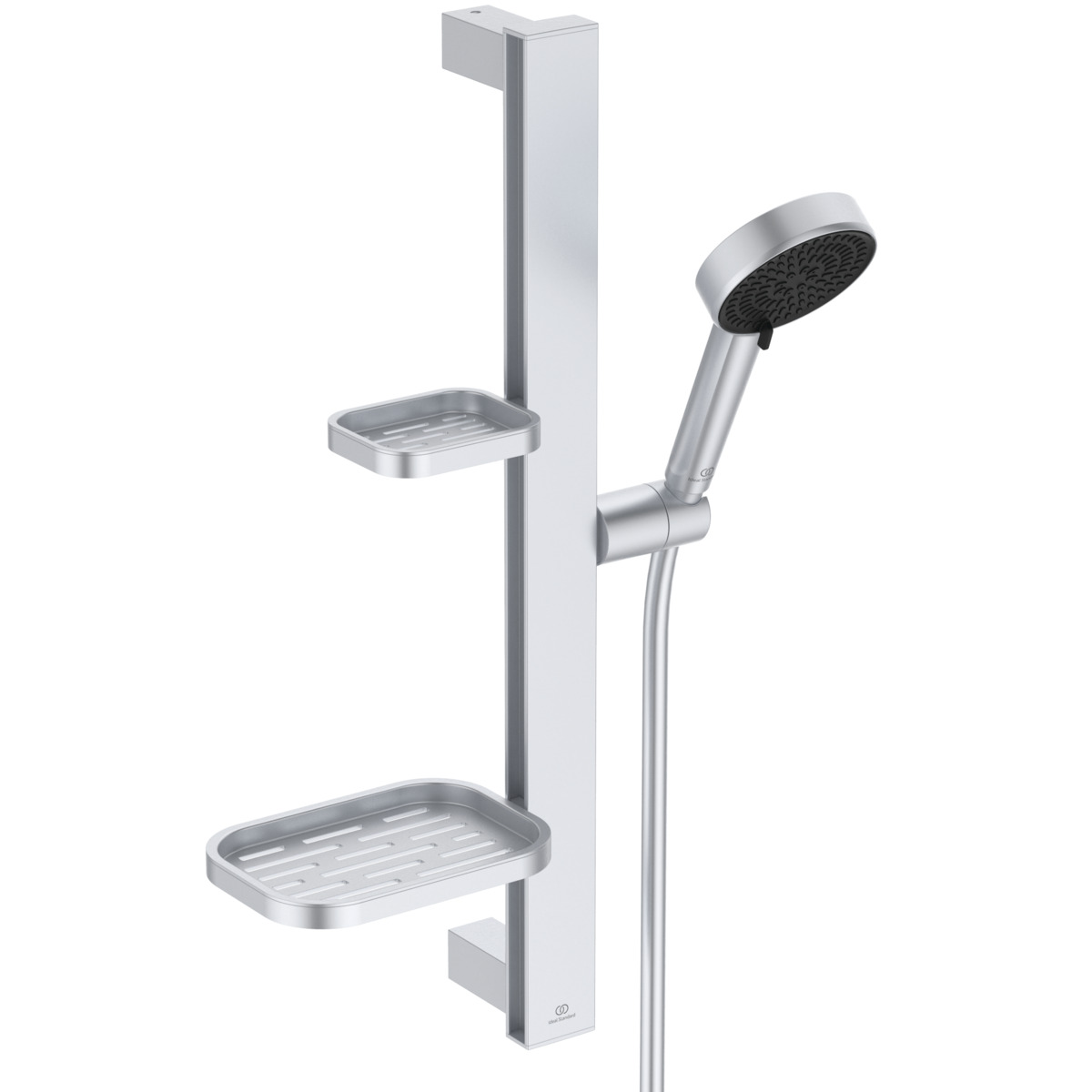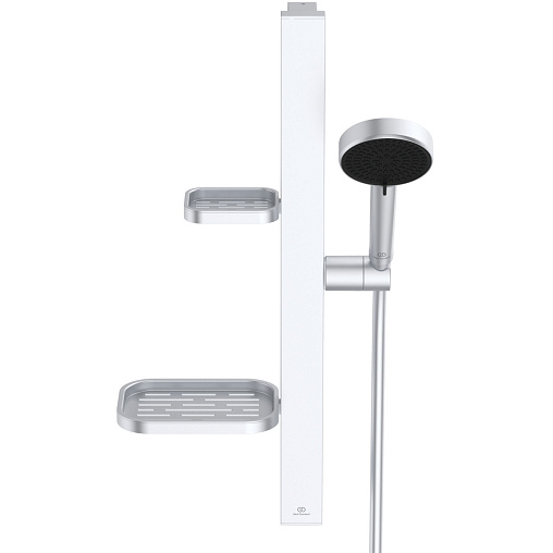 ALU+ Душевой гарнитур, штанга с направляющими справа и слева для установки держателя и полок по выбору при первичном монтаже; держатель лейки с регулируемым углом наклона; 2-функциональная душевая лейка 100 мм с ограничением потока 8 л/мин., маленькая полочка 130 мм (макс. нагрузка 7кг), большая полочка 208 мм (макс. нагрузка 7кг), шланг 1750 мм Idealflex