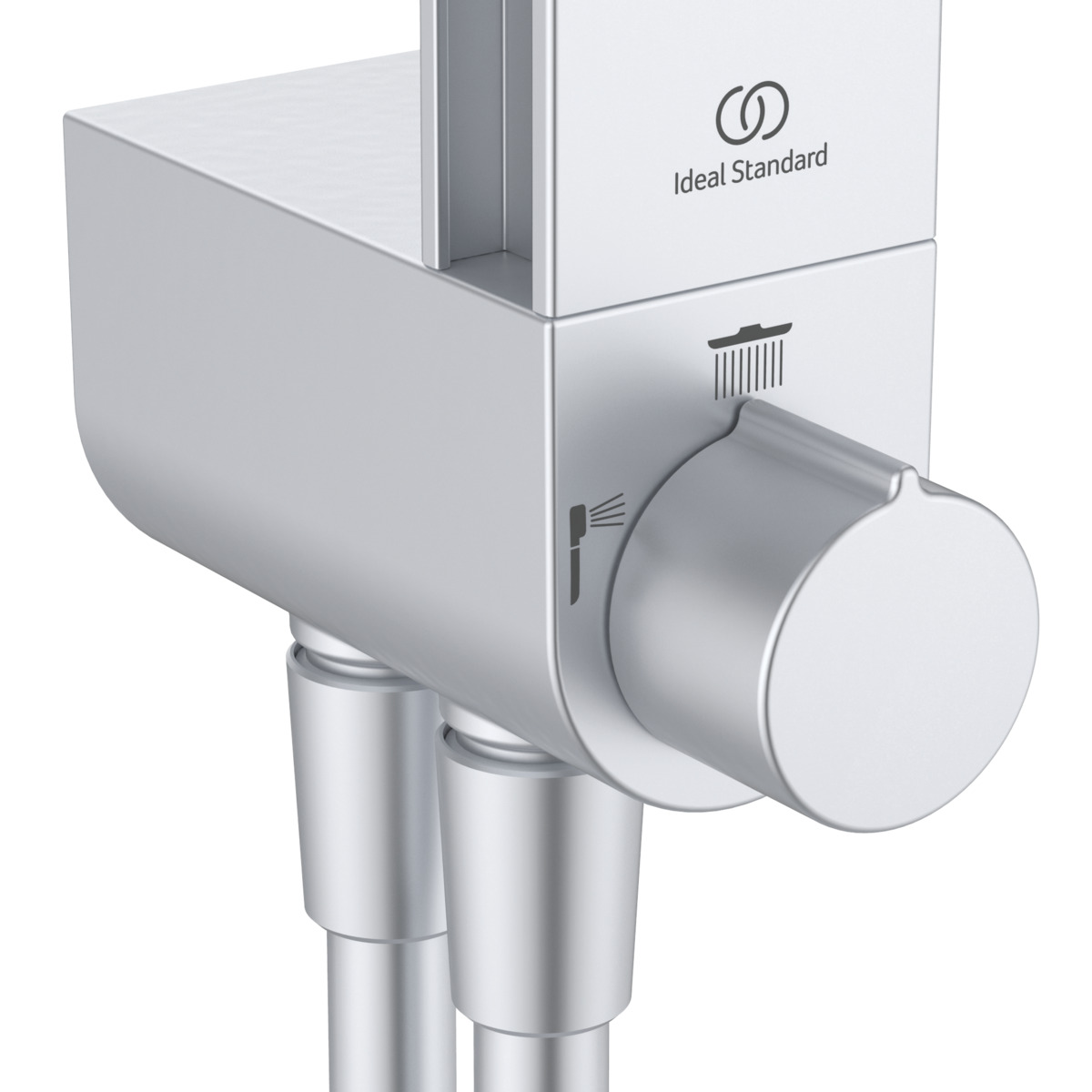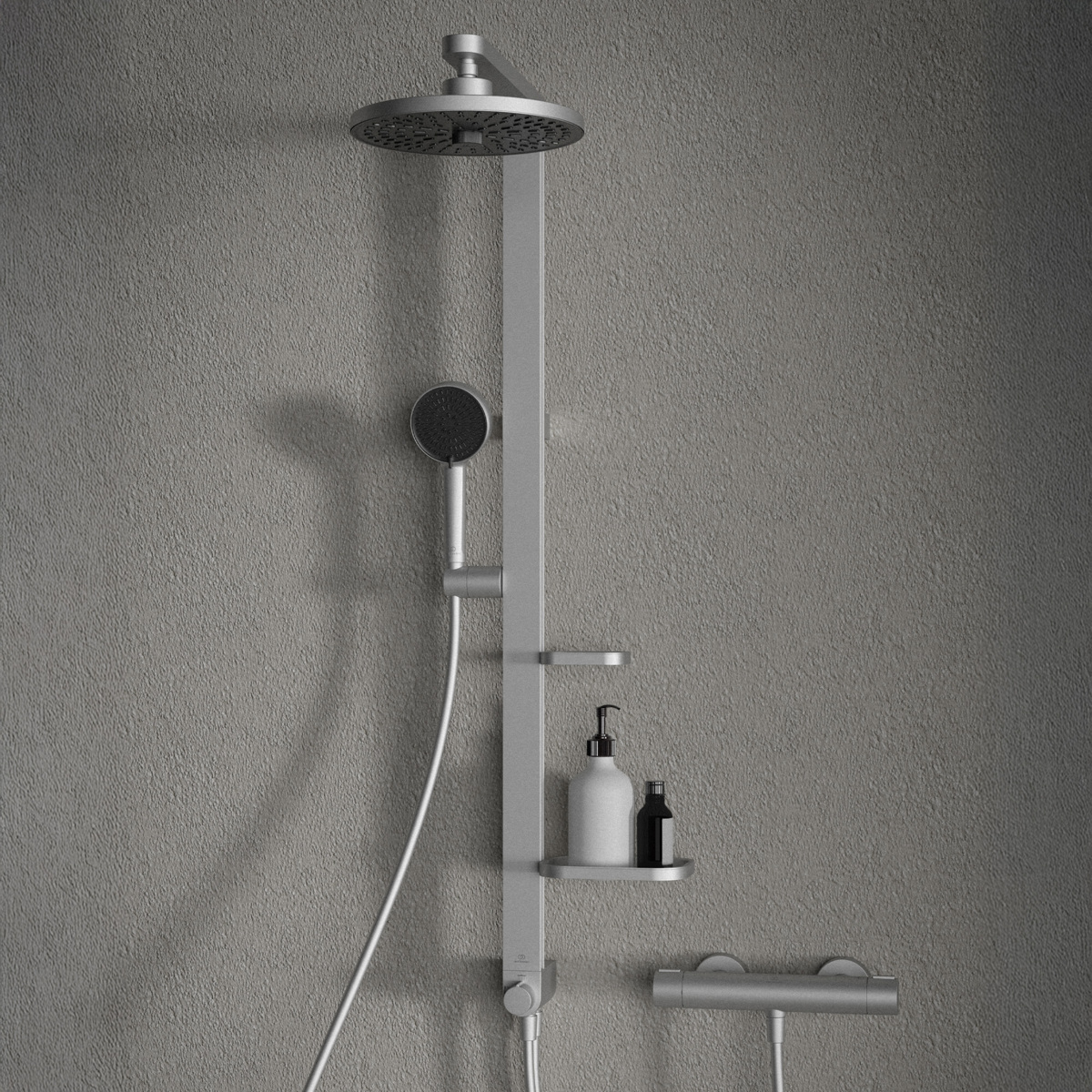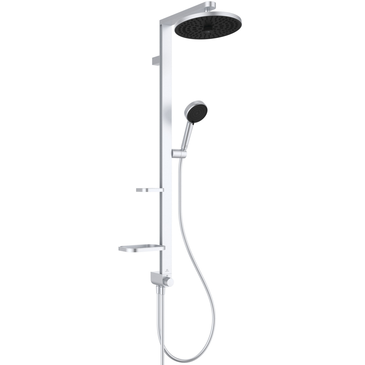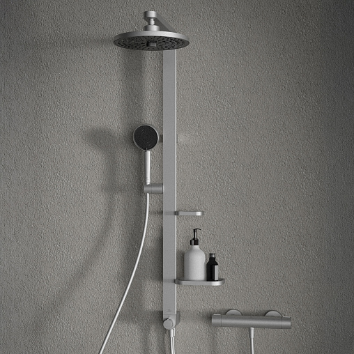 ALU+ Душевая система без смесителя (для монтажа с настенным смесителем), 2-функциональный керамический переключатель, штанга с направляющими справа и слева для установки держателя и полок по выбору при первичном монтаже; держатель лейки с регулируемым углом наклона; свободная высота регулировки кронштейна крепления к стене; круглый 2-функциональный верхний душ 260 мм, ограничение потока 12 л/мин., 2-функциональная душевая лейка 100 мм с ограничением потока 8 л/мин., маленькая полочка 130 мм (макс. нагрузка 7кг), большая полочка 208 мм (макс. нагрузка 7кг), шланг 1750 мм Idealflex, шланг 800 мм Idealflex для подключения к смесителю