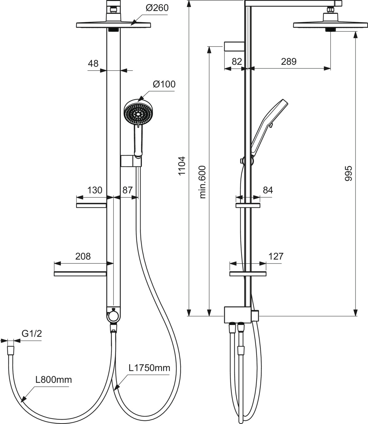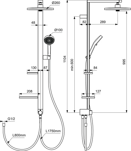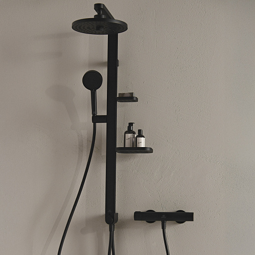 ALU+ Душевая система без смесителя (для монтажа с настенным смесителем), 2-функциональный керамический переключатель, штанга с направляющими справа и слева для установки держателя и полок по выбору при первичном монтаже; держатель лейки с регулируемым углом наклона; свободная высота регулировки кронштейна крепления к стене; круглый 2-функциональный верхний душ 260 мм, ограничение потока 12 л/мин., 2-функциональная душевая лейка 100 мм с ограничением потока 8 л/мин., маленькая полочка 130 мм (макс. нагрузка 7кг), большая полочка 208 мм (макс. нагрузка 7кг), шланг 1750 мм Idealflex, шланг 800 мм Idealflex для подключения к смесителю