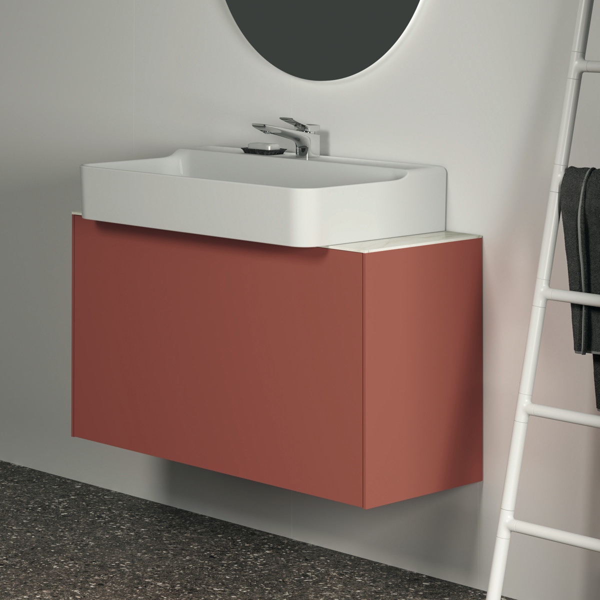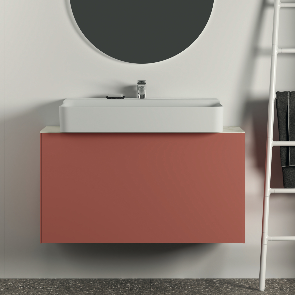 CONCA Тумба 100 см для раковины, узкая проекция 37 см, без столешницы. Комбинированная система для удобного использования (открытие "Push to open" + закрытие "Soft close"). Внутренняя отделка ящиков цвета антрацит. 1 внешний и 1 внутренний ящик. Для монтажа со столешницей из литьевого мрамора (без выреза / вырез под заказ) 100 см T4346.