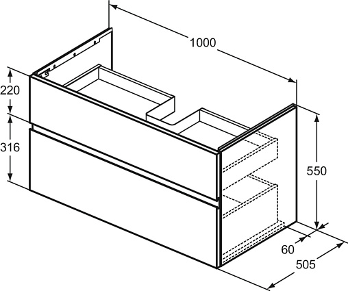 FINESSE Тумба для раковины 100х50 см для подвесного монтажа, 2 ящика, система плавного закрытия. Конструкция без ручек - паз под верхним и над нижним выдвижными ящиками для легкого открывания. C крепежом. Рекомендуется сифон Space Saving EE23033967 (заказывается дополнительно). Для монтажа с раковинами EXTRA Vanity 101 см T4366, T4369, T4368 или SOLOS Vanity 101,5 см T5370, T5369, T5561 или La Dolce Vita Vanity 106 см E2631, E2702, E2677 или i.Life B Vanity 121 см T4603