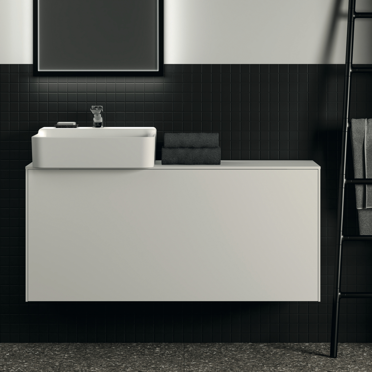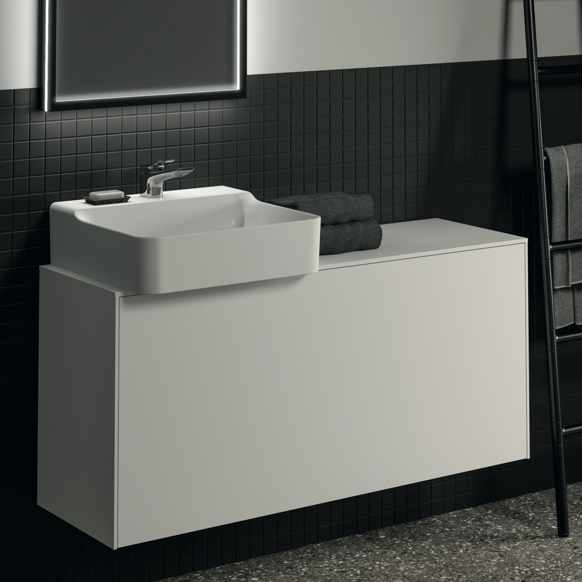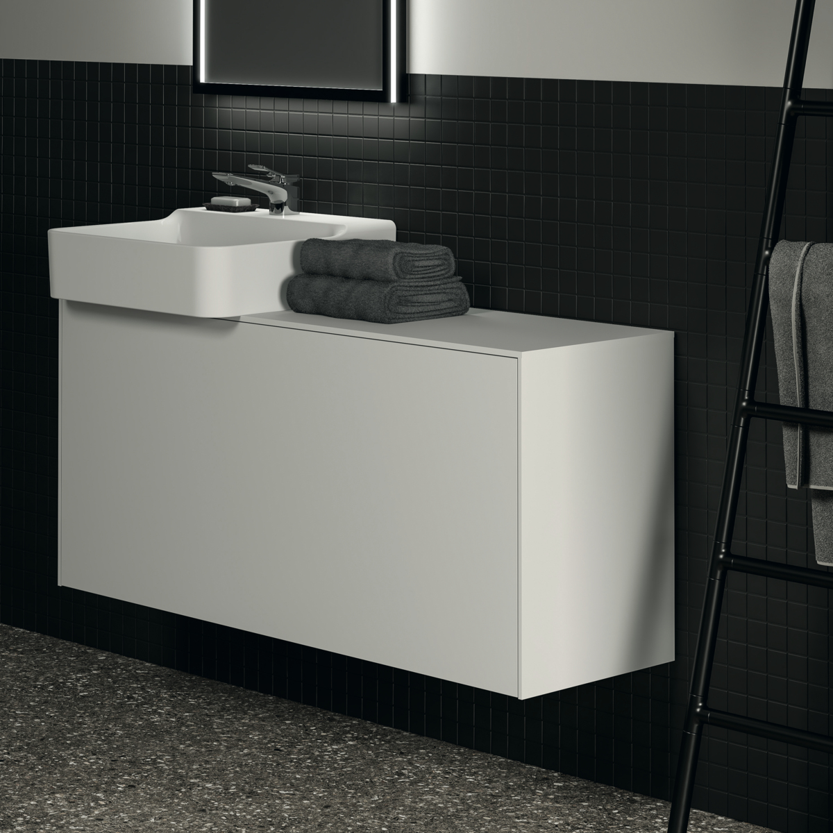 CONCA Тумба 120 см для раковины, узкая проекция 37 см (вырез в столешнице под заказ). Комбинированная система для удобного использования (открытие "Push to open" + закрытие "Soft close"). Внутренняя отделка ящиков цвета антрацит. 1 внешний и 1 внутренний ящик. Рекомендуется сифон Space Saving EE23033967 (заказывается дополнительно)