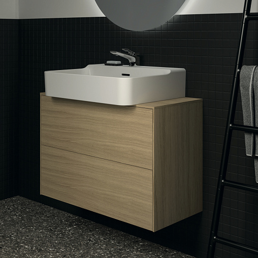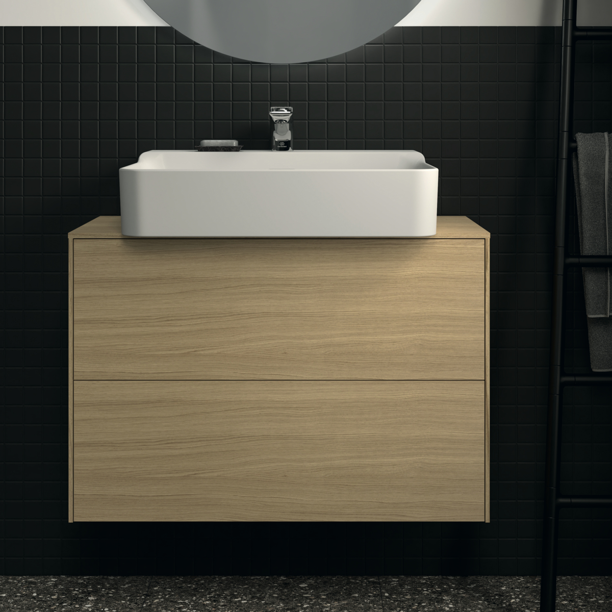 CONCA Тумба 80 см для раковины, узкая проекция 37 см, центральный вырез в столешнице. Комбинированная система для удобного использования (открытие "Push to open" + закрытие "Soft close"). Внутренняя отделка ящиков цвета антрацит. 2 внешних ящика. Для монтажа с раковинами Conca 40/50/60 см (с шлифованной нижней поверхностью) или Conca vessel 45/60 см или Extra 45/50/60/70 см (с шлифованной нижней поверхностью) или Extra vessel 50/60 см или Ipalyss vessel 40/55/60/65/80 см или Linda-X 50/60/75 см (с шлифованной нижней поверхностью)