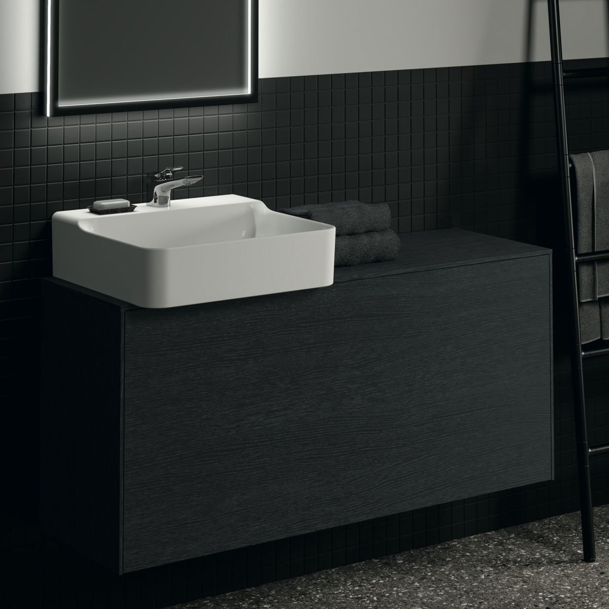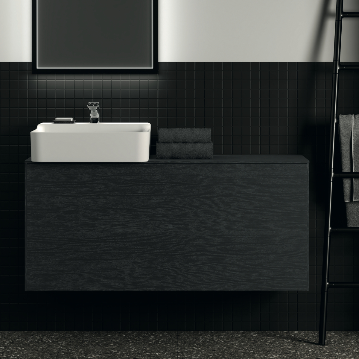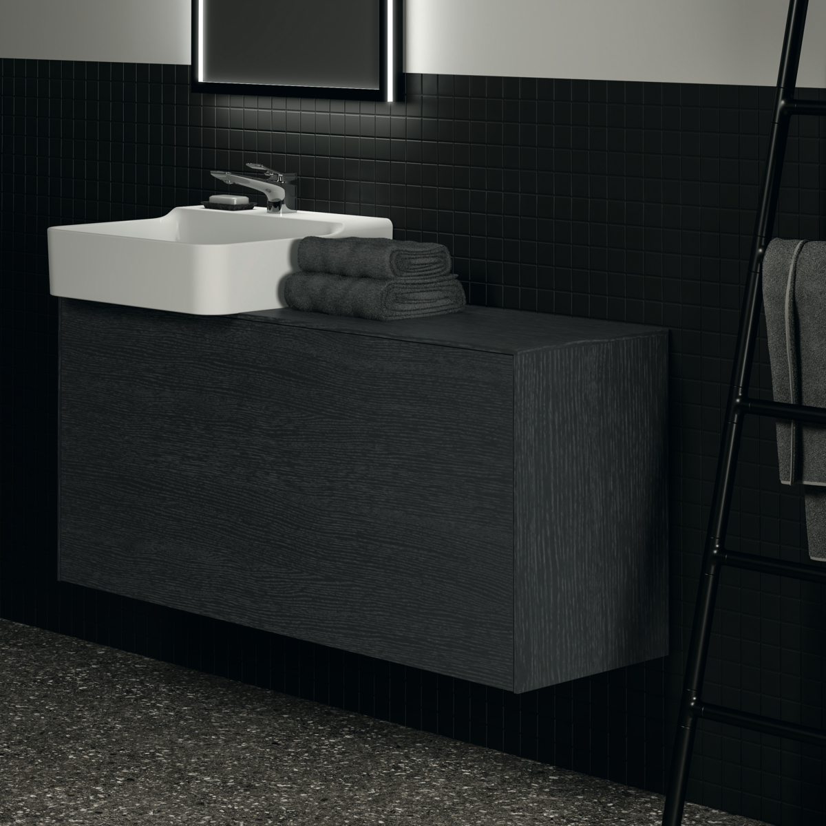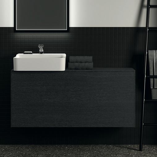 CONCA Тумба 120 см для раковины, узкая проекция 37 см (вырез в столешнице под заказ). Комбинированная система для удобного использования (открытие "Push to open" + закрытие "Soft close"). Внутренняя отделка ящиков цвета антрацит. 1 внешний и 1 внутренний ящик.  Рекомендуется сифон Space Saving EE23033967 (заказывается дополнительно)