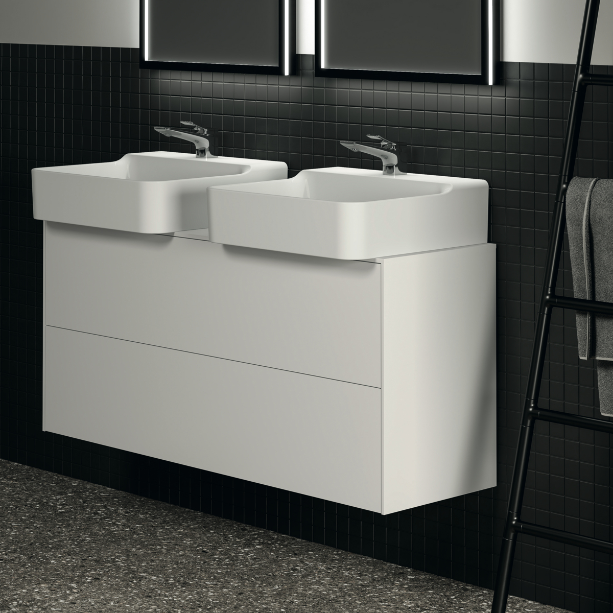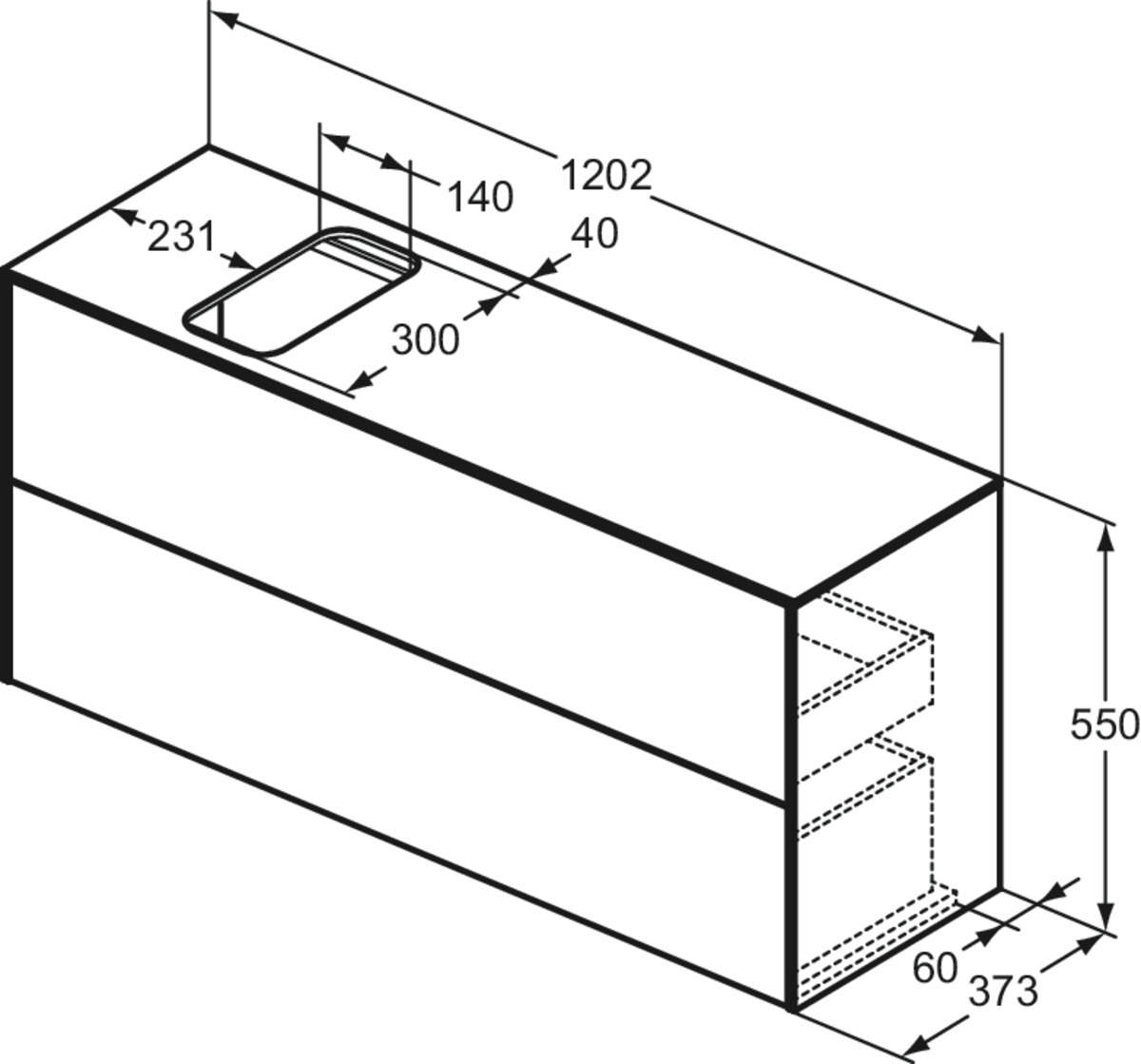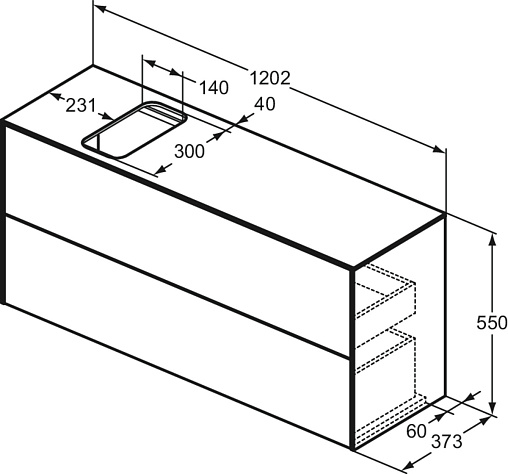 CONCA Тумба 120 см для раковины, узкая проекция 37 см, со столешницей (вырез под заказ). Комбинированная система для удобного использования (открытие "Push to open" + закрытие "Soft close"). Внутренняя отделка ящиков цвета антрацит. 2 внешних ящика