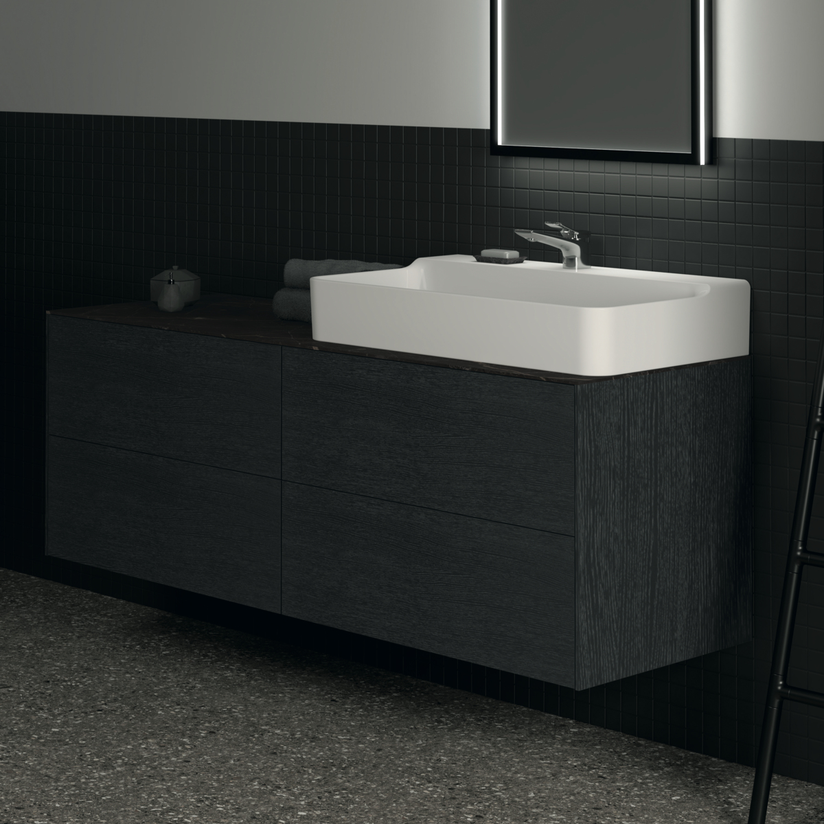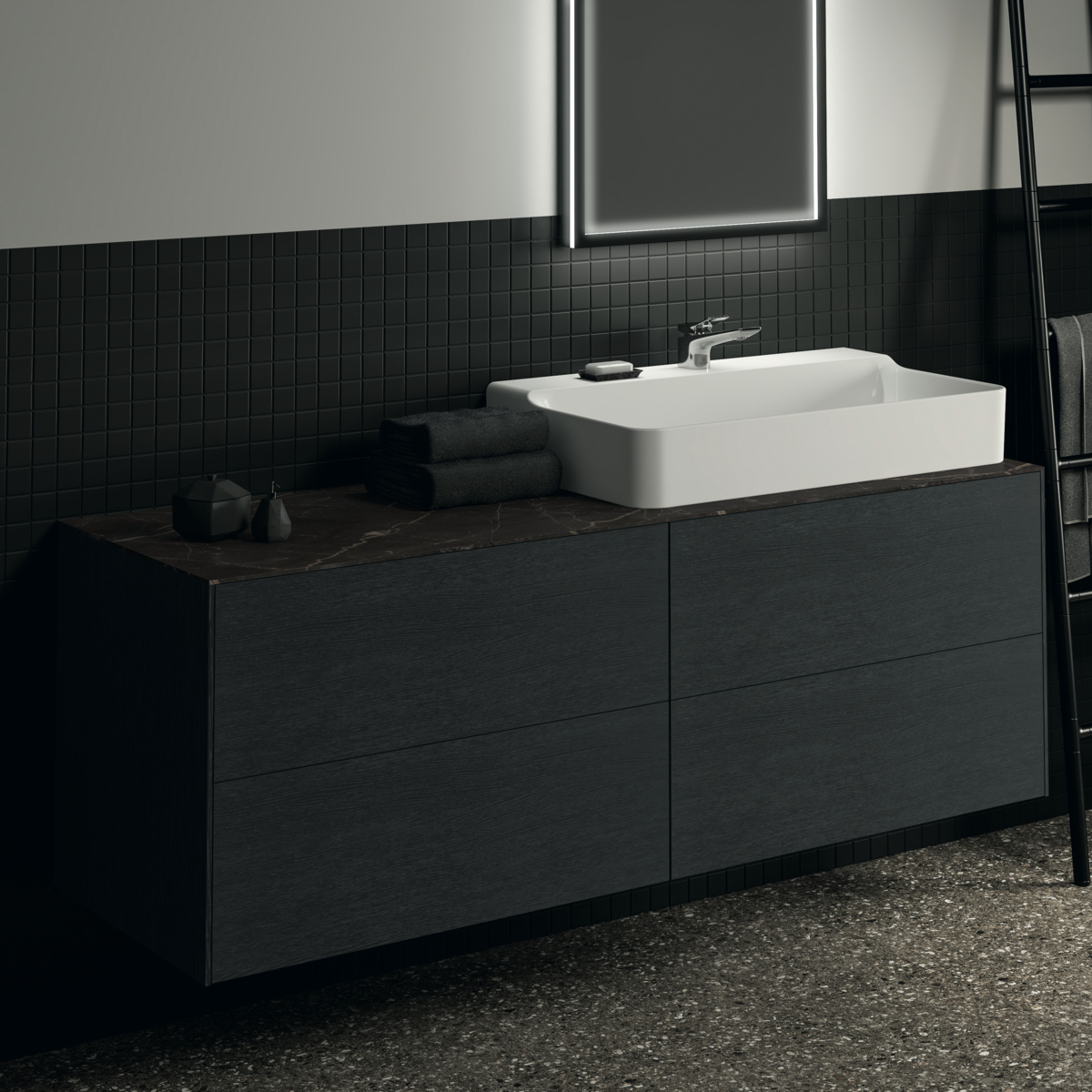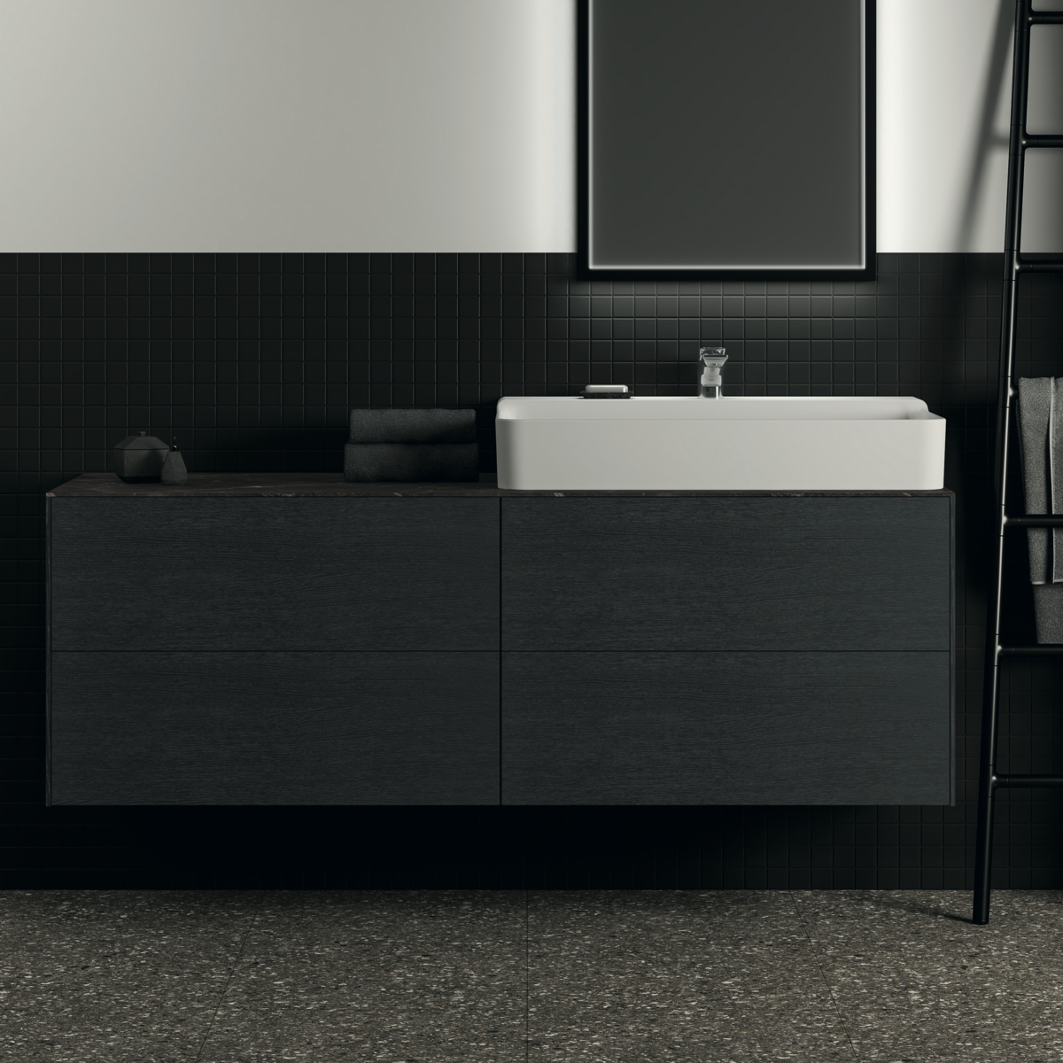 CONCA Тумба 160 см для раковины, без столешницы. Комбинированная система для удобного использования (открытие "Push to open" + закрытие "Soft close"). Внутренняя отделка ящиков цвета антрацит. 4 ящика. Для монтажа со столешницей из литьевого мрамора (без выреза / вырез под заказ) 160 см T4202.