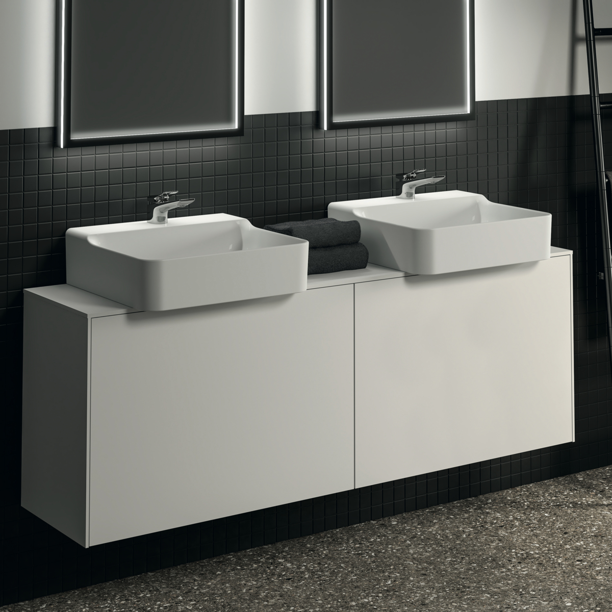 CONCA Тумба 160 см для раковины, узкая проекция 37 см, со столешницей (вырез под заказ). Комбинированная система для удобного использования (открытие "Push to open" + закрытие "Soft close"). Внутренняя отделка ящиков цвета антрацит. 2 внешних и 2 внутренних ящика