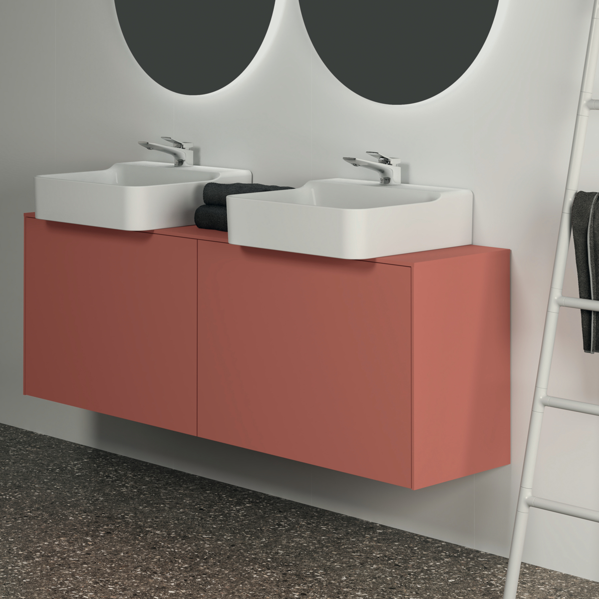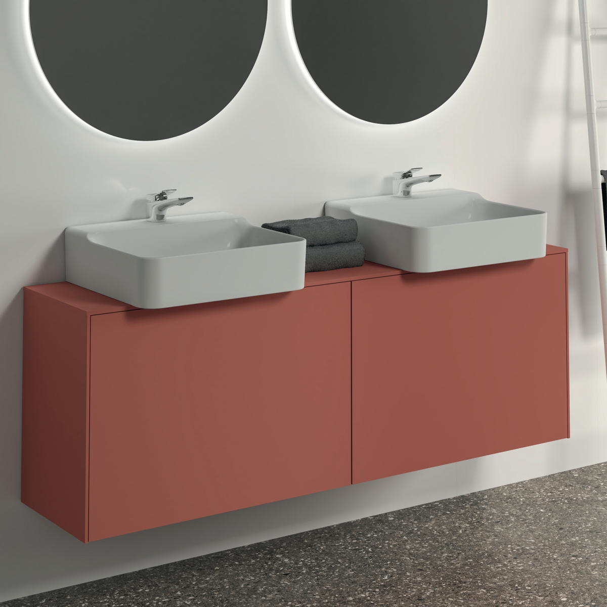CONCA Тумба 160 см для раковины, узкая проекция 37 см, со столешницей (вырез под заказ). Комбинированная система для удобного использования (открытие "Push to open" + закрытие "Soft close"). Внутренняя отделка ящиков цвета антрацит. 2 внешних и 2 внутренних ящика