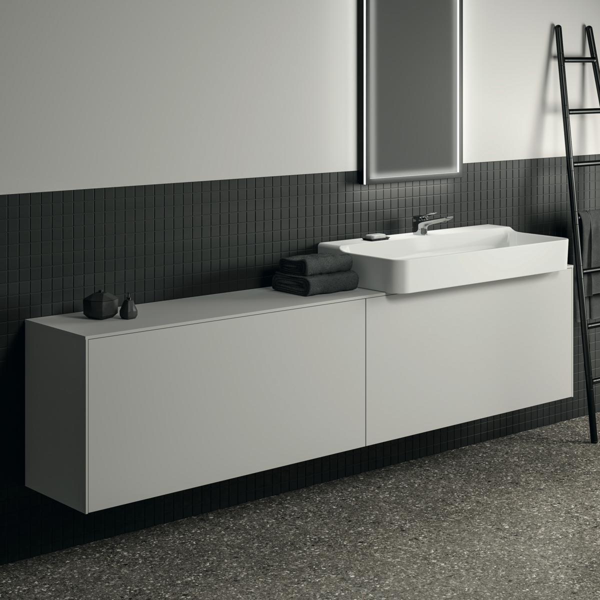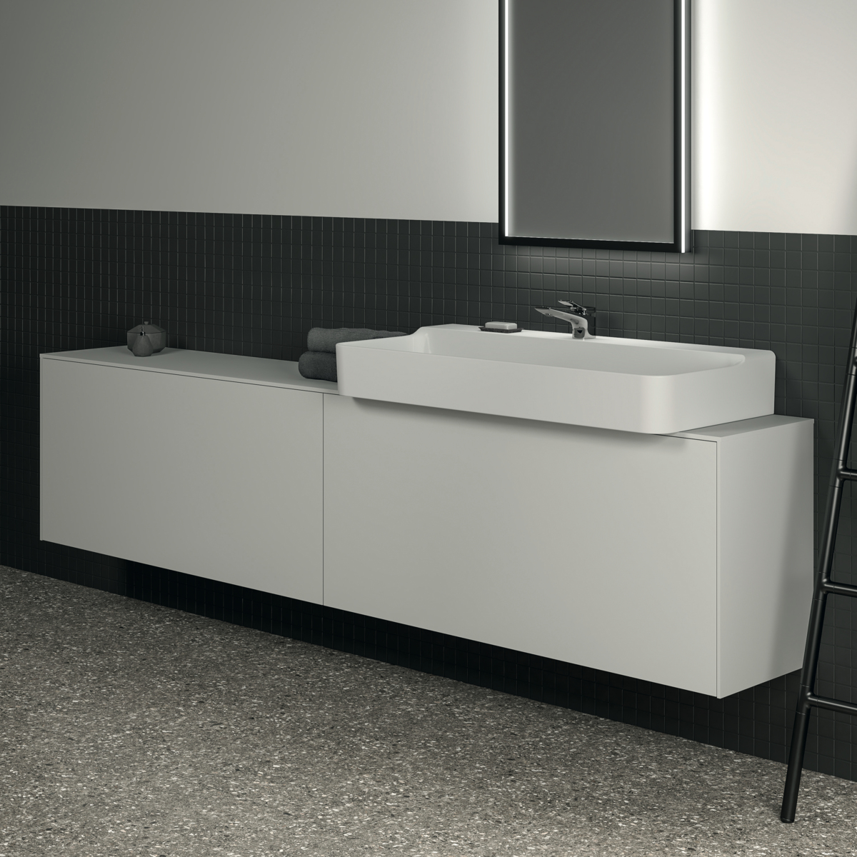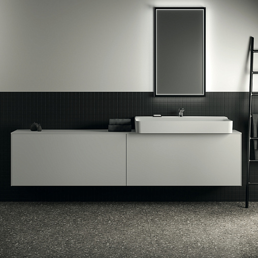 CONCA Тумба 240 см для раковины, узкая проекция 37 см (вырез в столешнице под заказ). Комбинированная система для удобного использования (открытие "Push to open" + закрытие "Soft close"). Внутренняя отделка ящиков цвета антрацит. 2 внешних и 2 внутренних ящика.