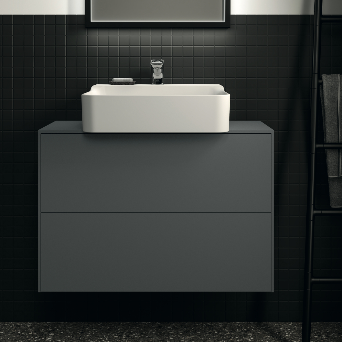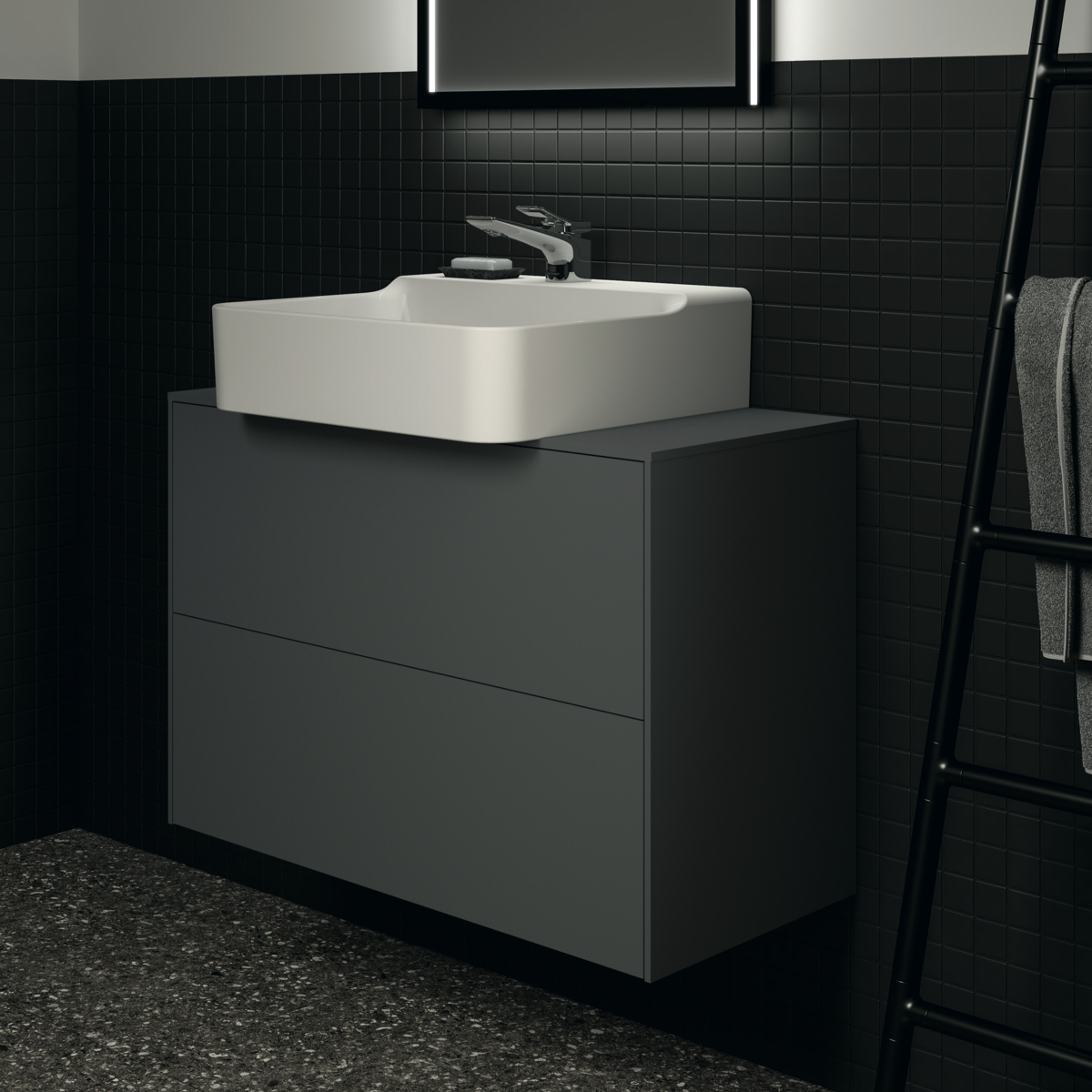 CONCA Тумба 80 см для раковины, узкая проекция 37 см, центральный вырез в столешнице. Комбинированная система для удобного использования (открытие "Push to open" + закрытие "Soft close"). Внутренняя отделка ящиков цвета антрацит. 2 внешних ящика. Для монтажа с раковинами Conca 40/50/60 см (с шлифованной нижней поверхностью) или Conca vessel 45/60 см или Extra 45/50/60/70 см (с шлифованной нижней поверхностью) или Extra vessel 50/60 см или Ipalyss vessel 40/55/60/65/80 см или Linda-X 50/60/75 см (с шлифованной нижней поверхностью)