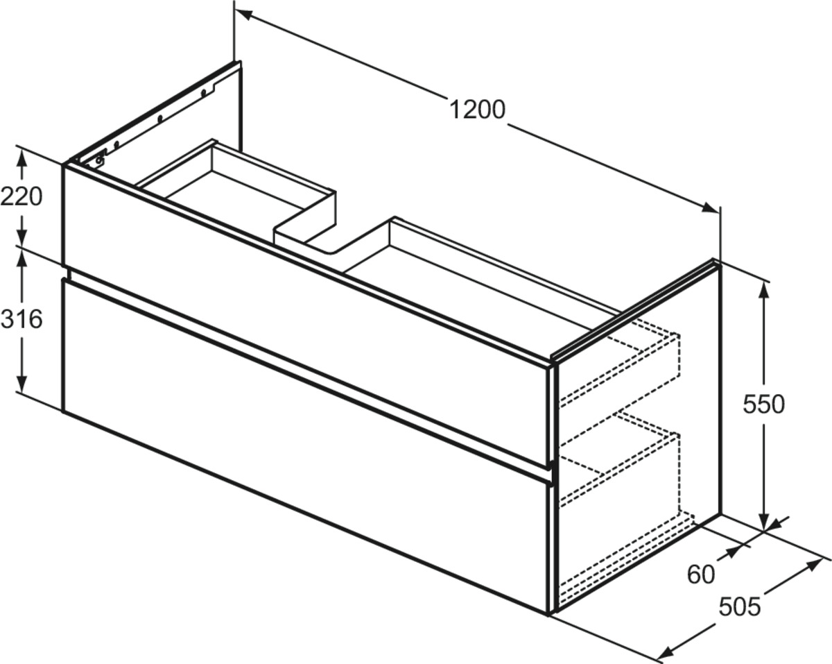 FINESSE Асимметричная тумба для раковины 120х50 см для подвесного монтажа, левая версия, 2 ящика, система плавного закрытия. Конструкция без ручек - паз под верхним и над нижним выдвижными ящиками для легкого открывания. C крепежом. Рекомендуется сифон Space Saving EE23033967 (заказывается дополнительно). Для монтажа с раковинами La Dolce Vita Asymmetrical Left 126 см E2632, E2706, E2696