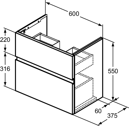 FINESSE Тумба для раковины 60х38 см для подвесного монтажа, 2 ящика, система плавного закрытия. Конструкция без ручек - паз под верхним и над нижним выдвижными ящиками для легкого открывания. C крепежом. Рекомендуется сифон Space Saving EE23033967 (заказывается дополнительно). Для монтажа с раковиной i.Life S Vanity 61 см T4590