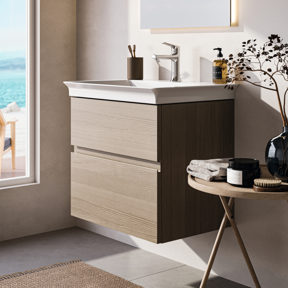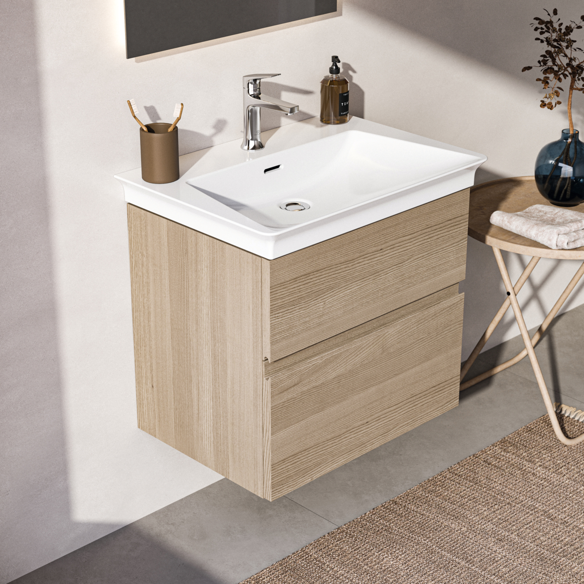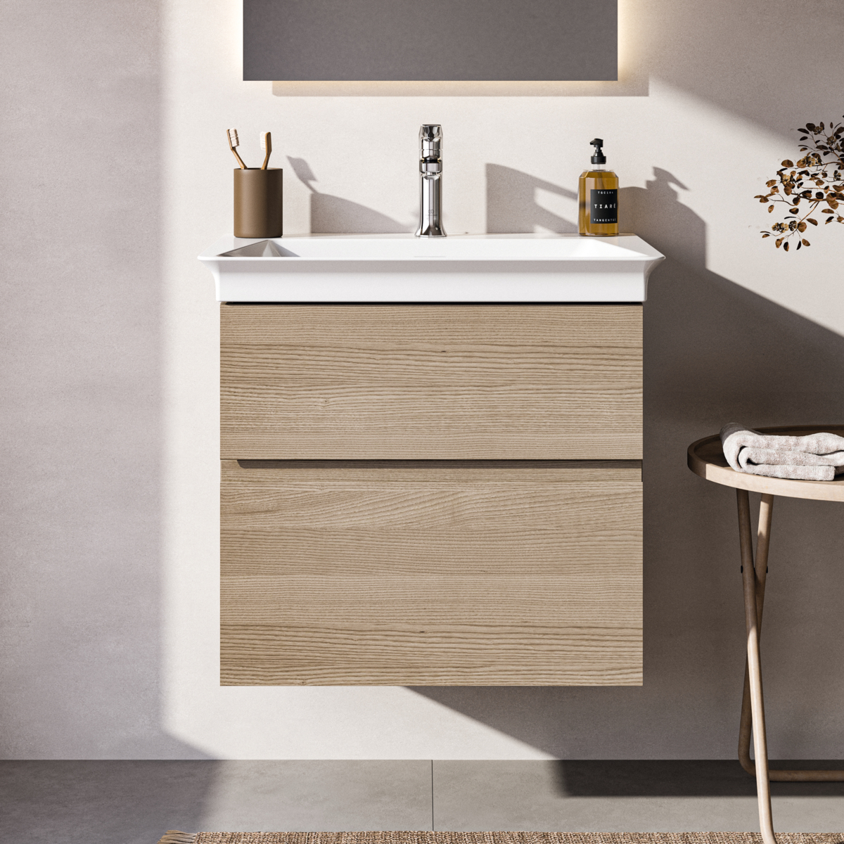 FINESSE Тумба для раковины 60х44 см для подвесного монтажа, 2 ящика, система плавного закрытия. Конструкция без ручек - паз под верхним и над нижним выдвижными ящиками для легкого открывания. C крепежом. Рекомендуется сифон Space Saving EE23033967 (заказывается дополнительно). Для монтажа с раковинами La Dolce Vita Symmetrical Vanity 66 см E2644, E2700, E2675 или Extra 60 см T3889, T3891, T3890 или Strada II Vanity 64 см T2991, T3633 или Connect Air Vanity 64 см или E0289 Tesi Vanity 62,5 см T3510 или I.Life A Vanity 64 см T4619 или Eurovit Vanity 61 см E0668