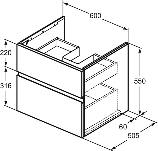 FINESSE Тумба для раковины 60х50 см для подвесного монтажа, 2 ящика, система плавного закрытия. Конструкция без ручек - паз под верхним и над нижним выдвижными ящиками для легкого открывания. C крепежом. Рекомендуется сифон Space Saving EE23033967 (заказывается дополнительно). Для монтажа с раковинами EXTRA Vanity 61 см T4358, T4361, T4360 или CALLA Vanity 66,5 см E2238, E2239, E2240 или i.Life B Vanity 61 см T4605