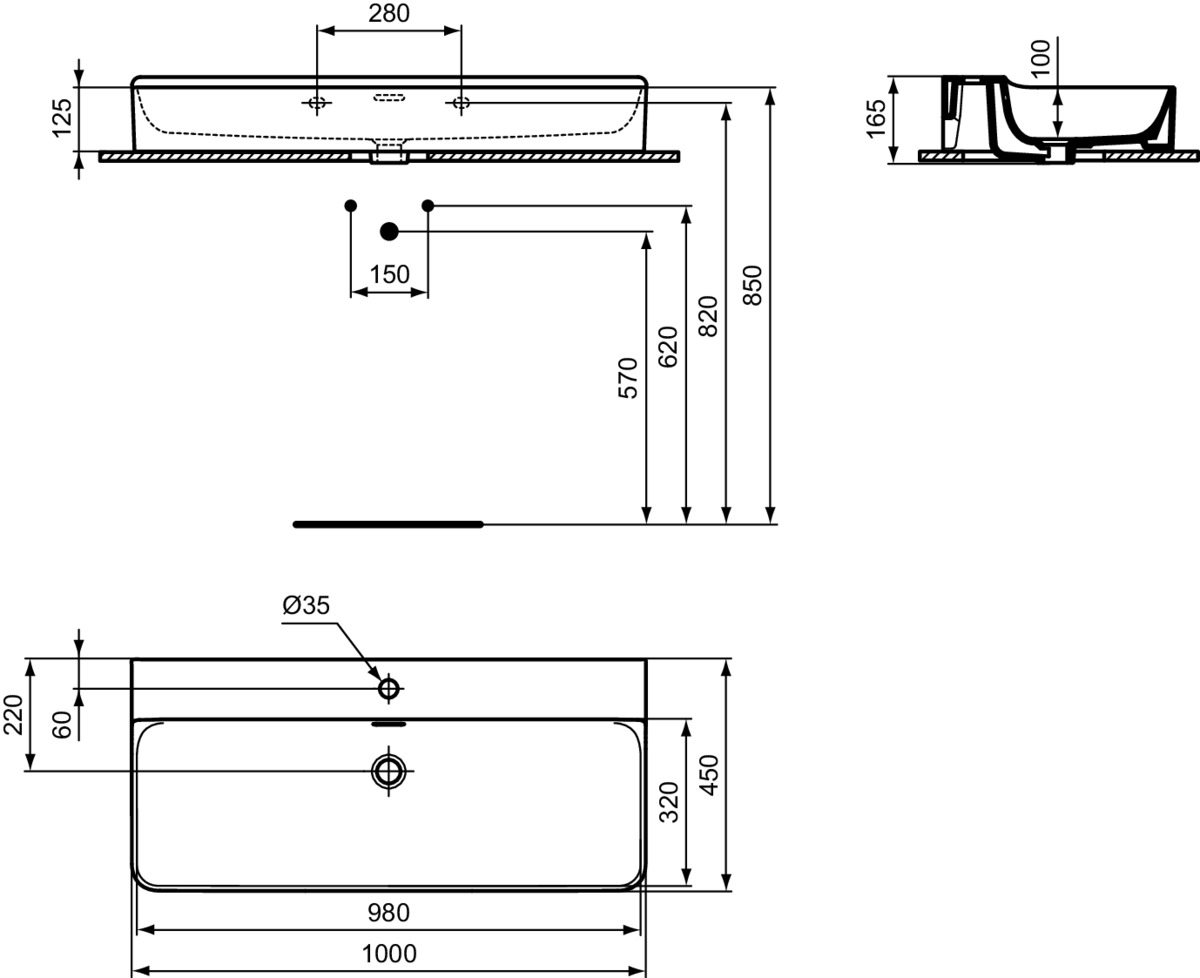 CONCA раковина 100 см с отверстием под смеситель, с отверстием перелива