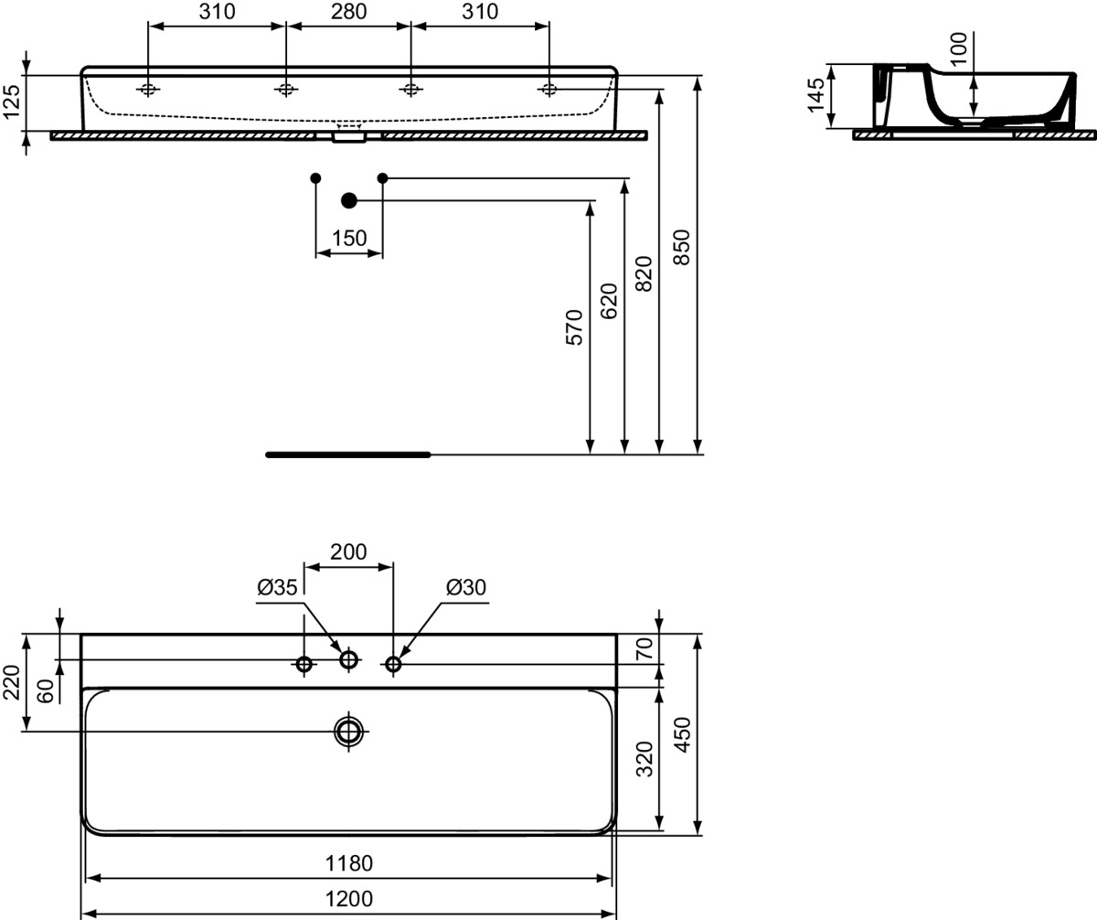 CONCA раковина 120 см с тремя отверстиями под смеситель, без отверстия перелива