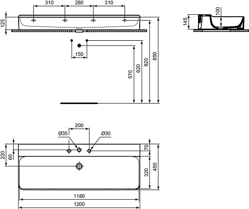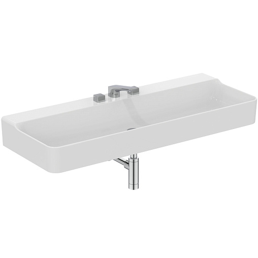 Подвесная раковина Conca 120х45х14,5 см, с 3 отверстиями под смесители, без отверстия перелива, санфарфор, с отв. под смеситель