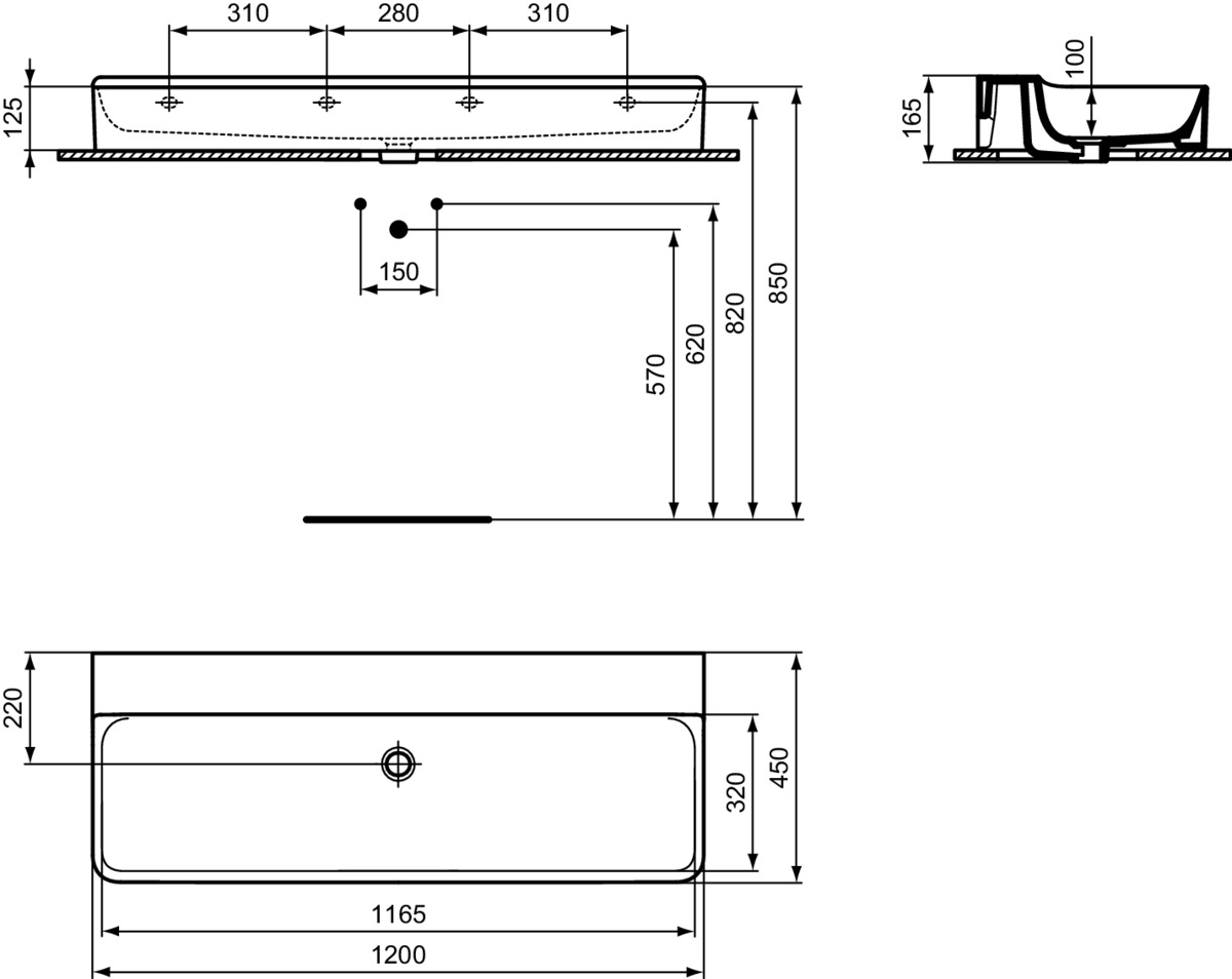 CONCA раковина 120 см без отверстия под смеситель, без отверстия перелива