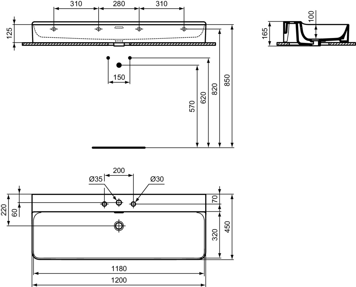 CONCA раковина 120 см с тремя отверстиями под смеситель, с отверстием перелива
