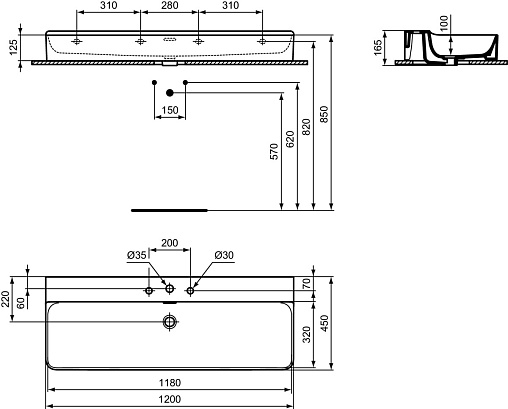 Подвесная раковина Conca 120х45х16,5 см, с 3 отверстиями под смесители, санфарфор, с отв. под смеситель