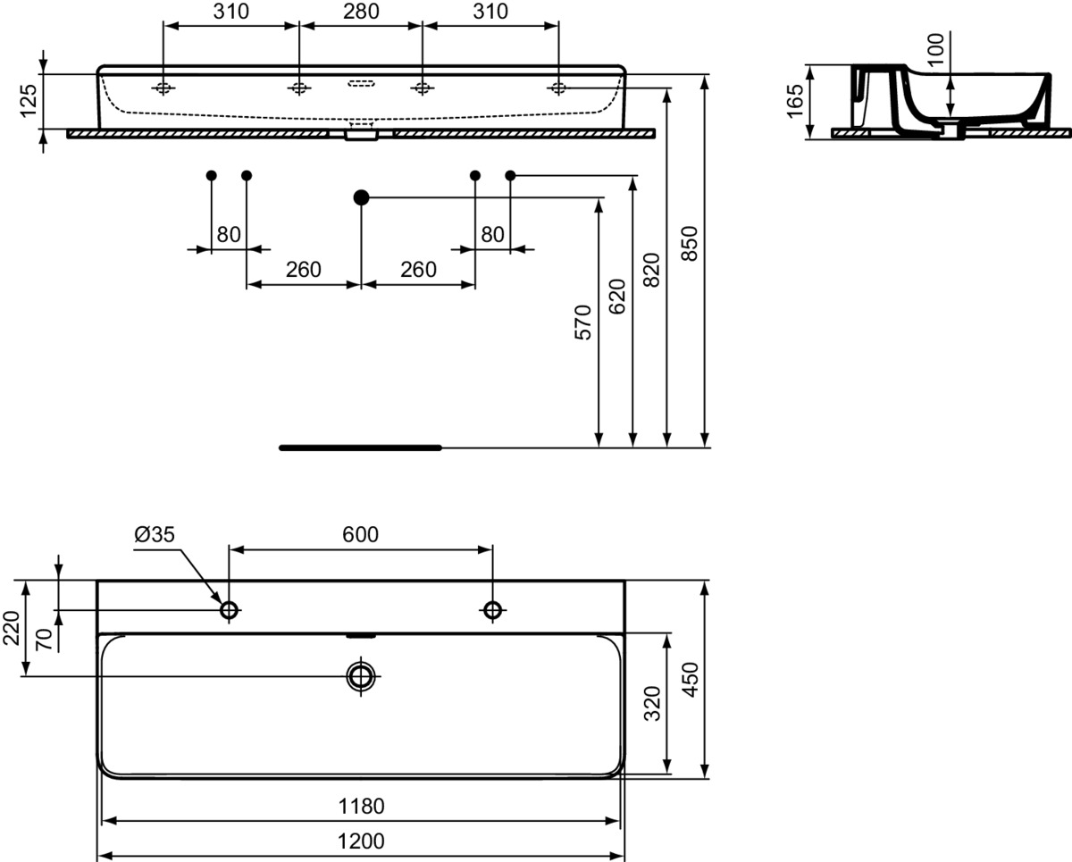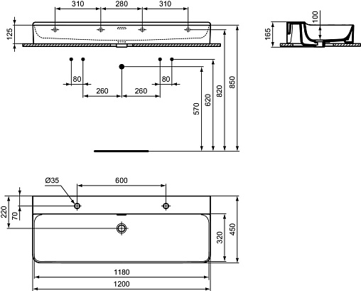 CONCA раковина 120 см с двумя отверстиями под смесители, с отверстием перелива