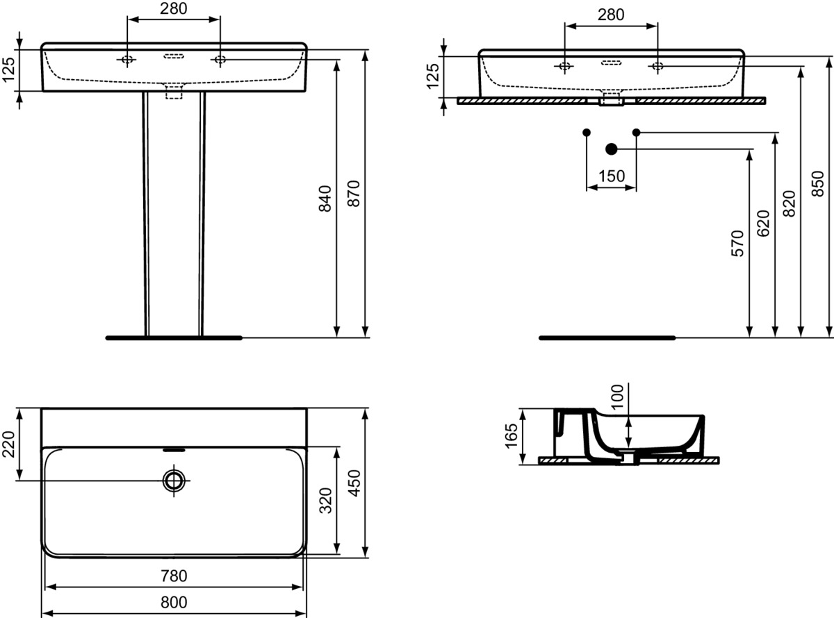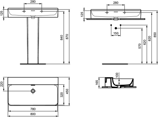 CONCA раковина 80 см без отверстия под смеситель, с отверстием перелива